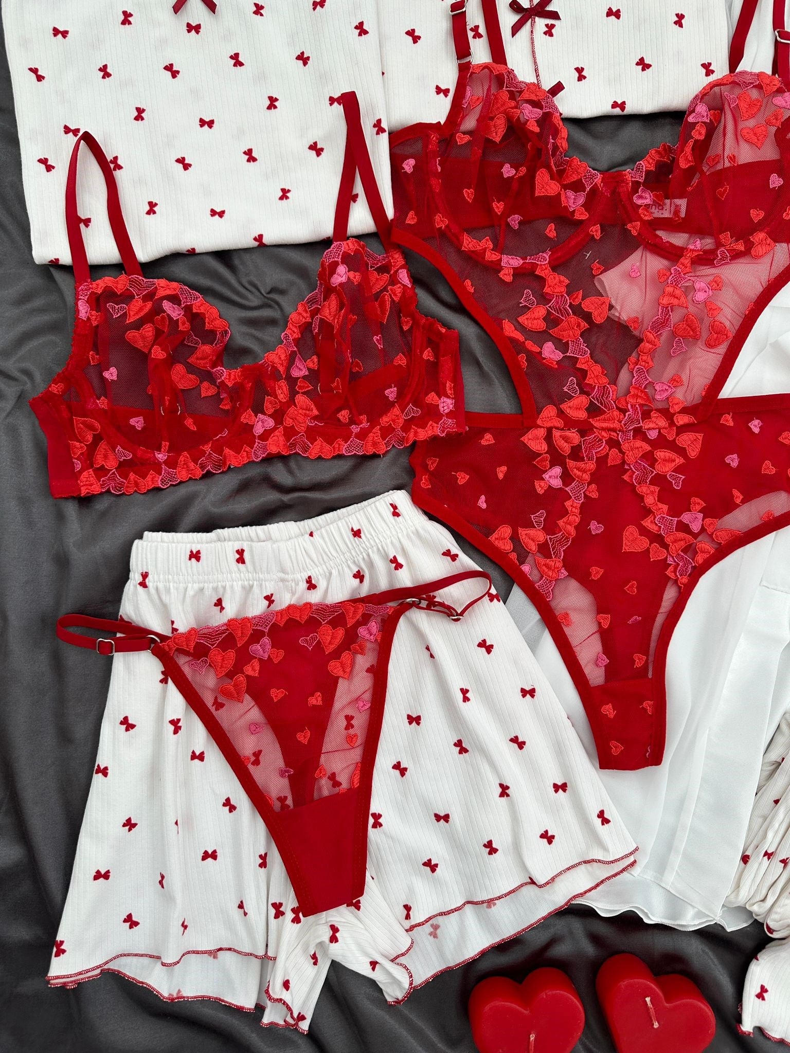 İthal kalp işleme detaylı brode bodysuit, bralet ve tanga ile birlikte