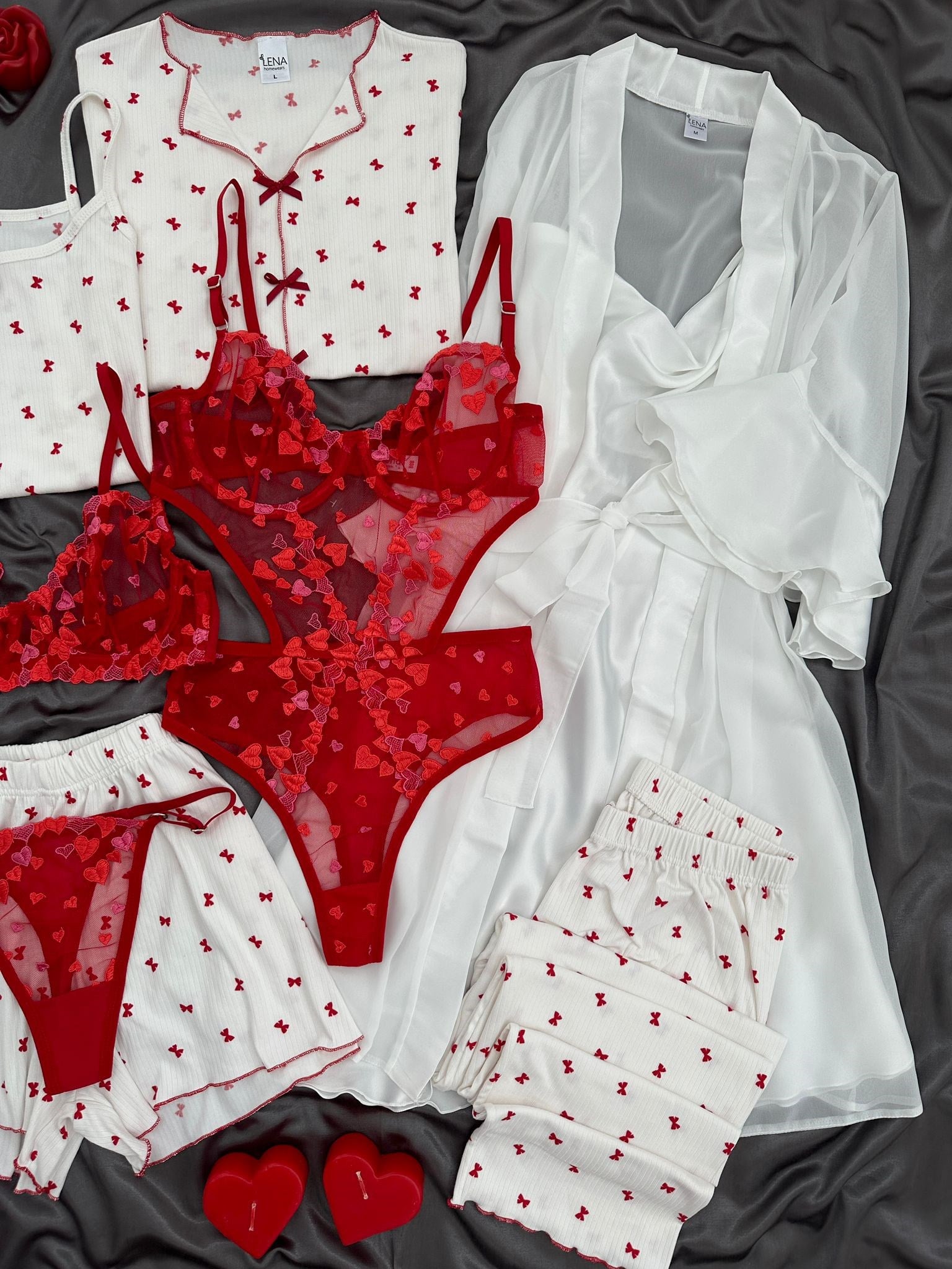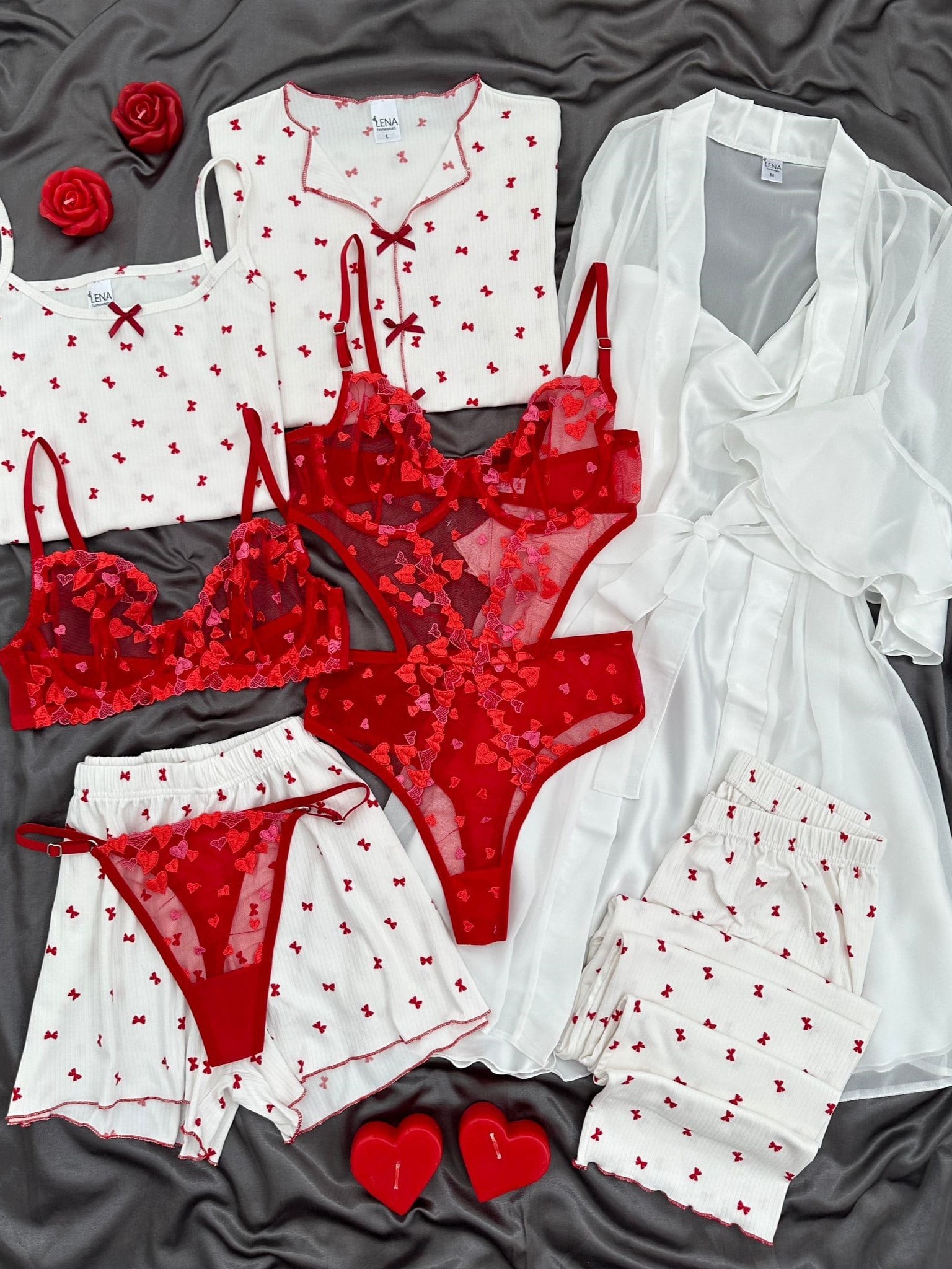 Yumuşacık kırmızı fiyonklu detaylı kısa kollu üst, uzun paçalı alt, askılı üst ve şort pijama takımı