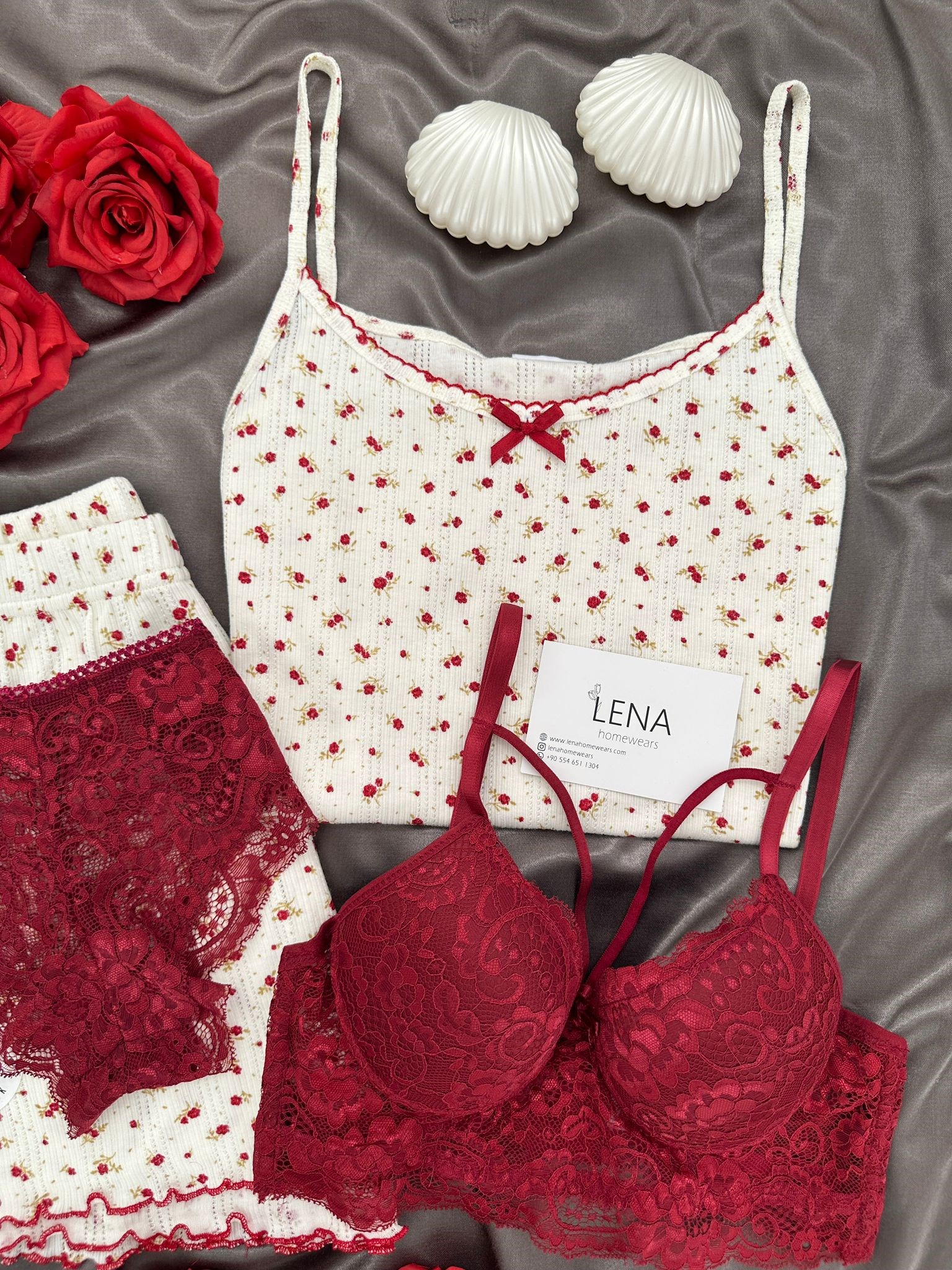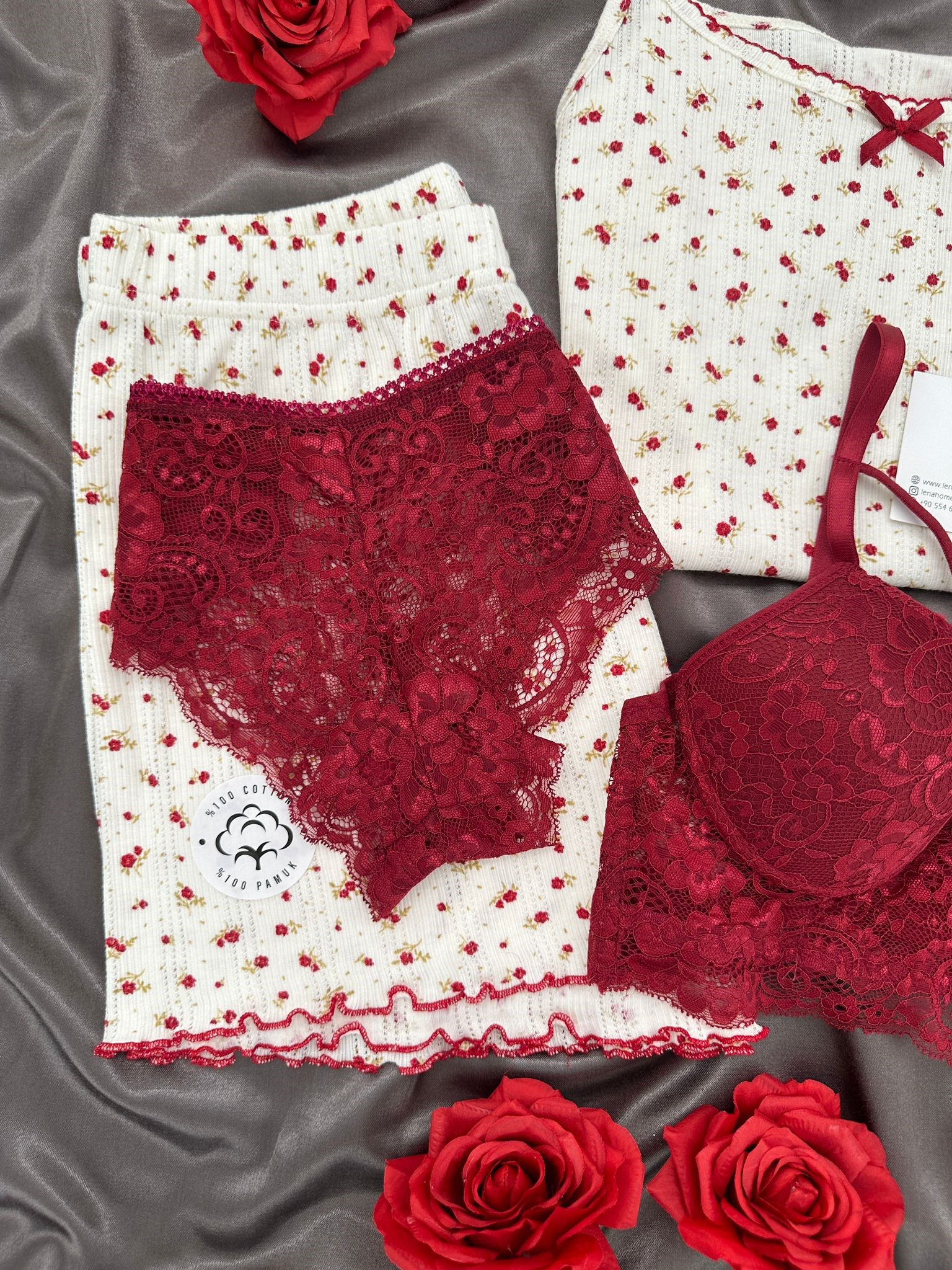 Bordo Çiçek Desenli Pamuklu 4’lü Şortlu Pijama Takımı