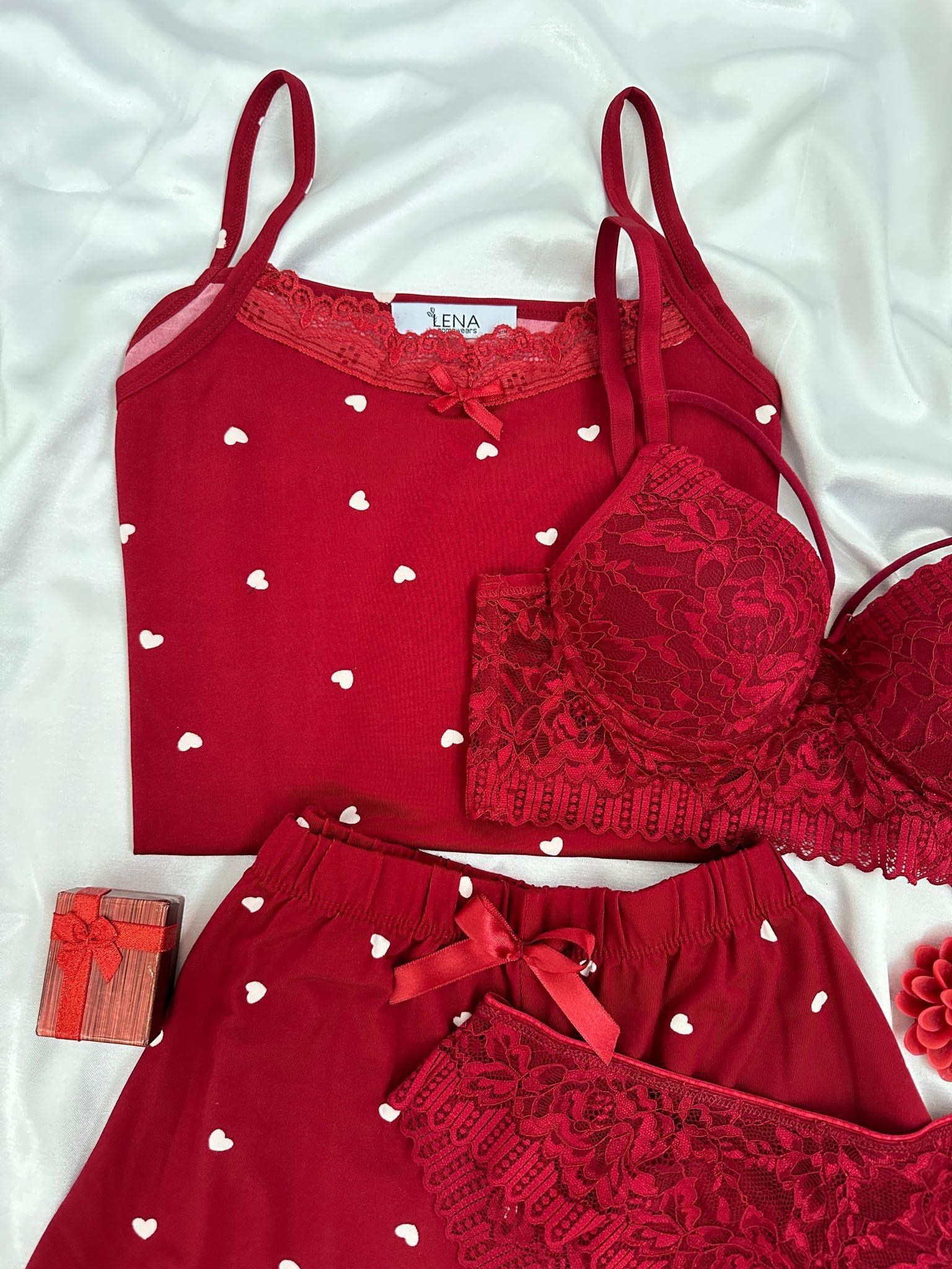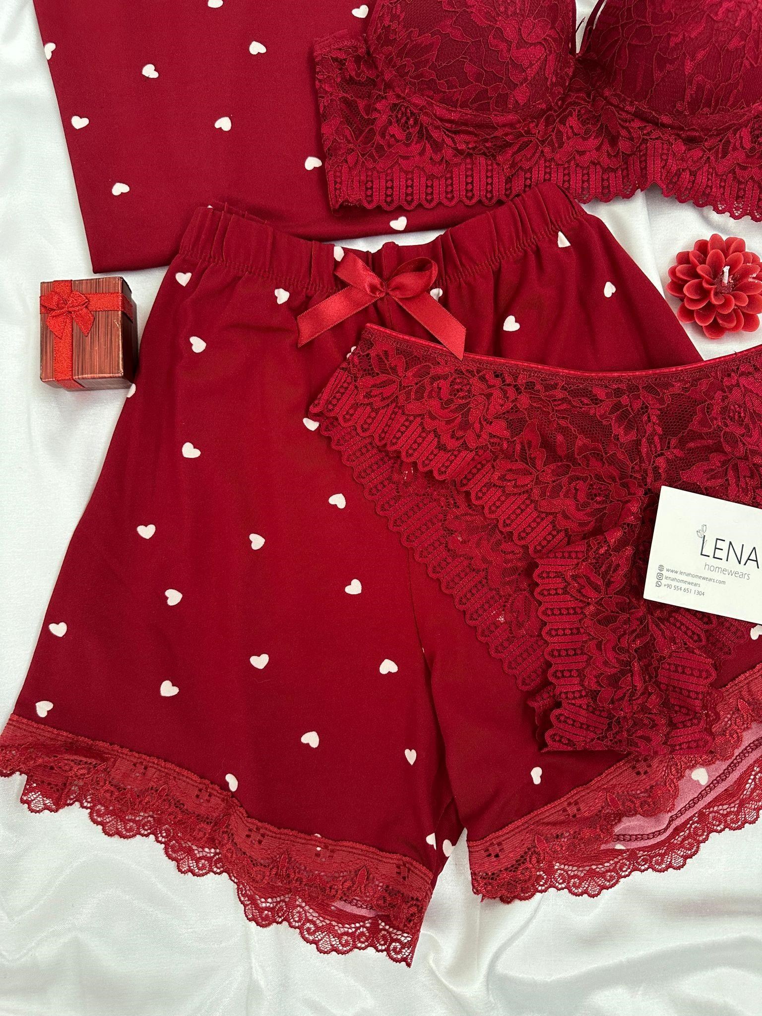 Bordo Kalp Desenli Dörtlü Şortlu Pijama Takımı