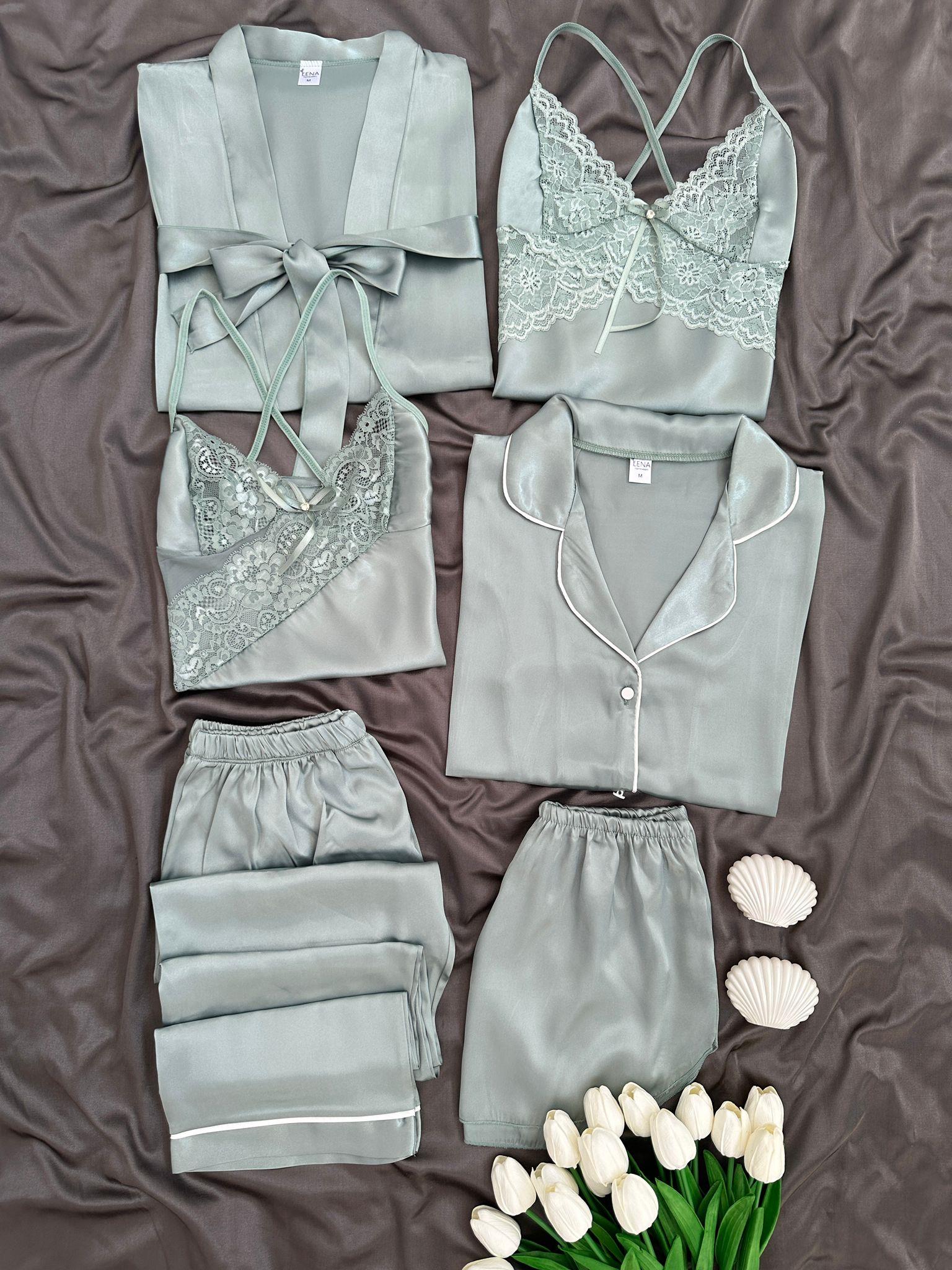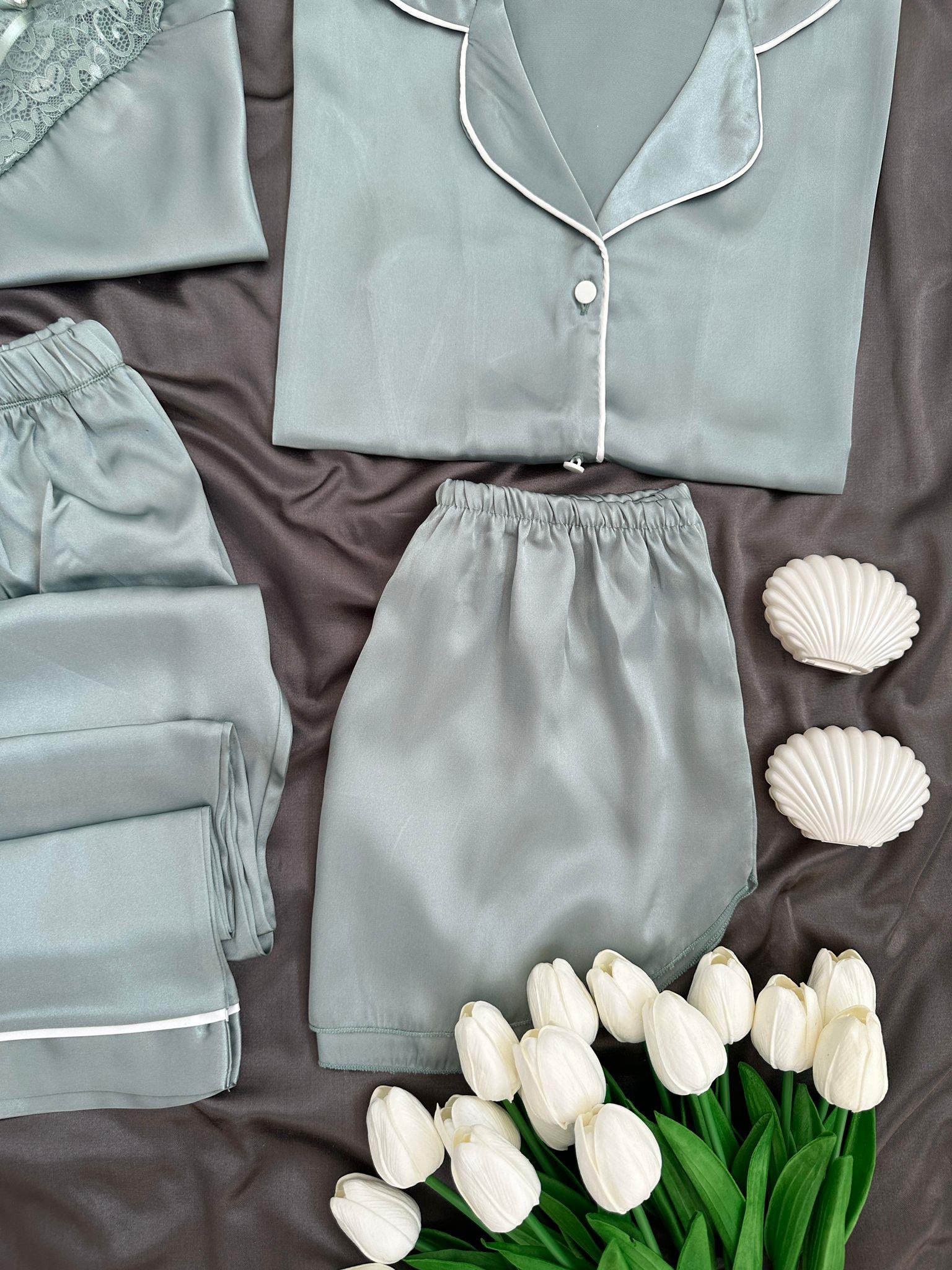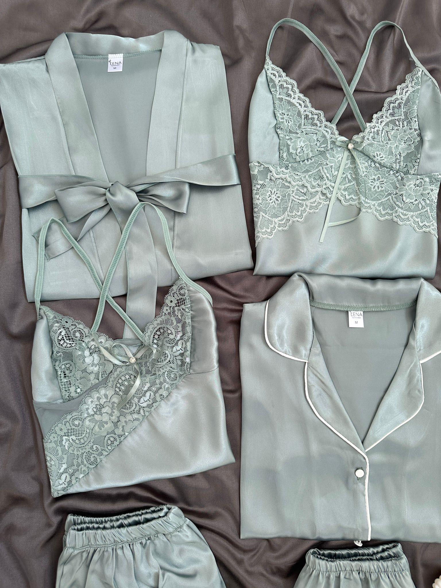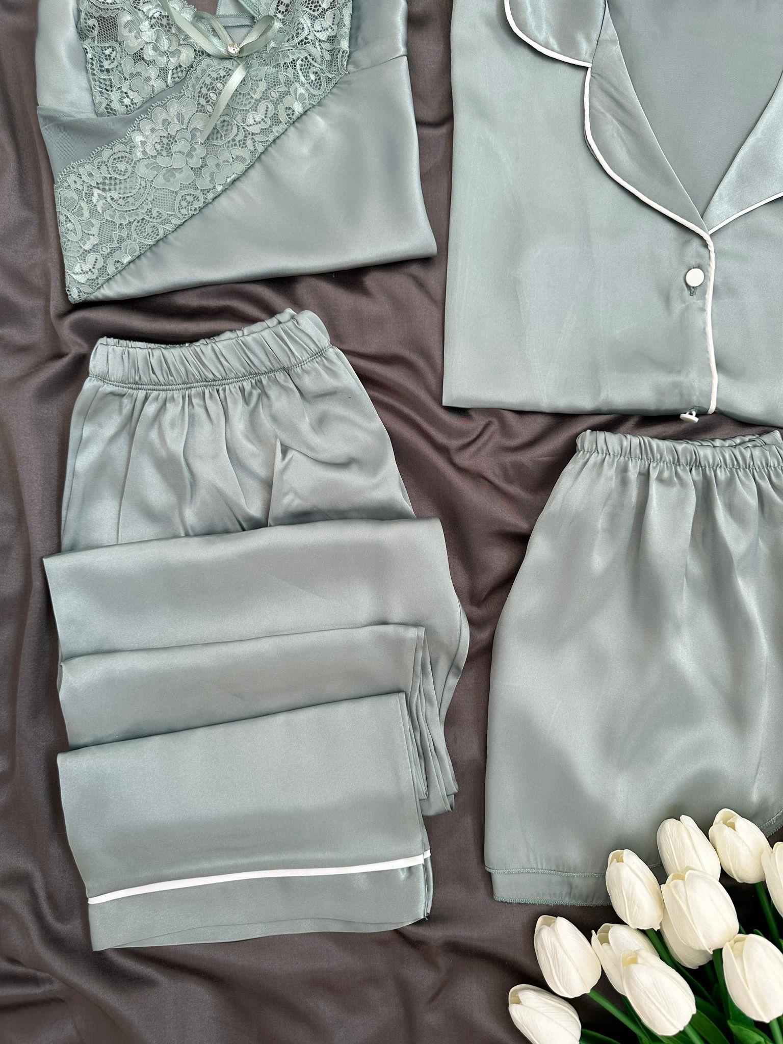 Çağla Harly Çeyiz Seti Kutulu Gönderim 🎁 Yumuşacık ipeksi saten dokusu ile dantel detaylı askılı mini gecelik, askılı üst ve şort; ekru biye detaylı düğmeli üst ve uzun paçalı alt pijama takımı, kuşaklı sabahlık ile birlikte ✨