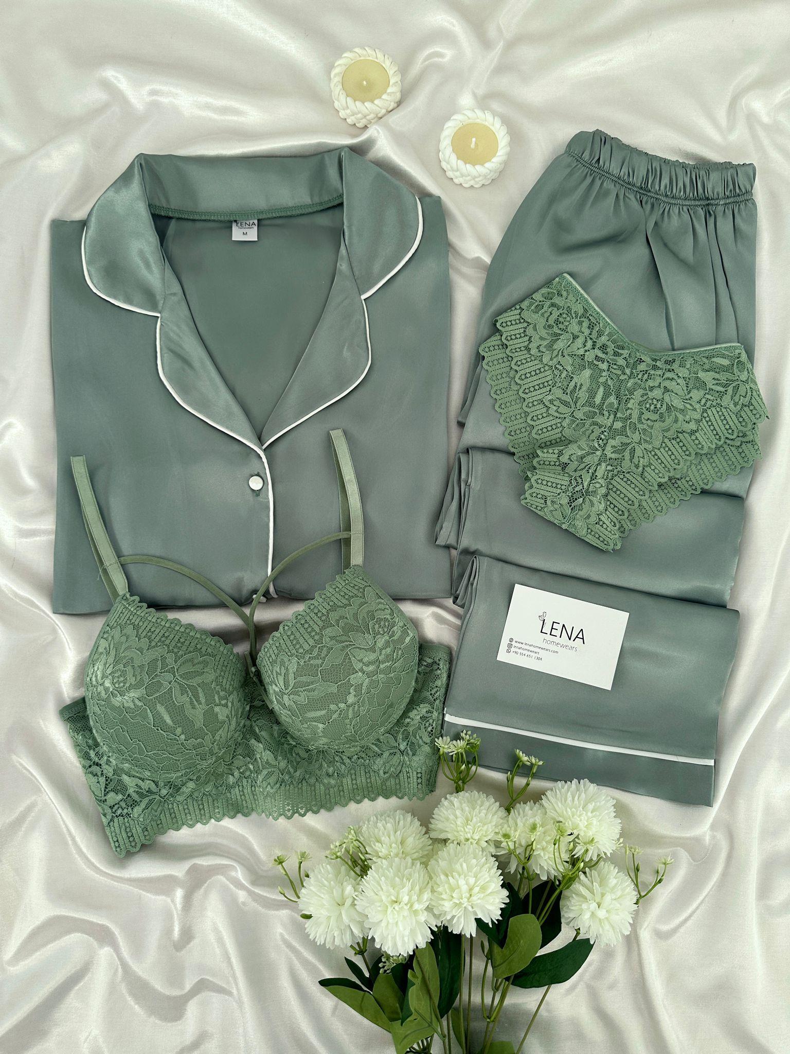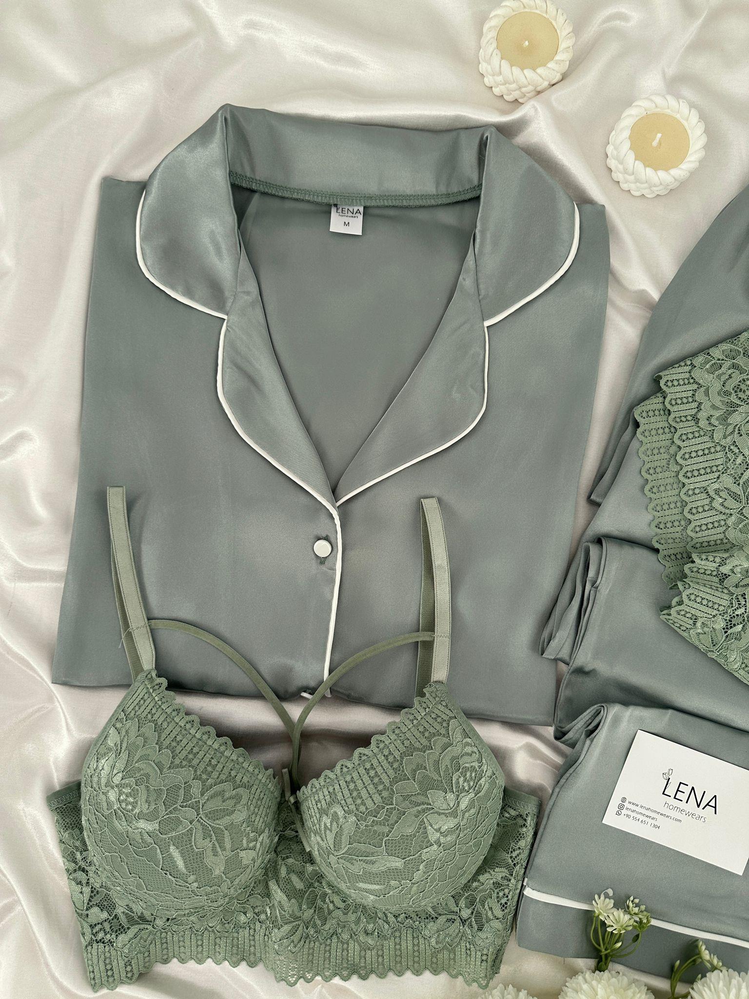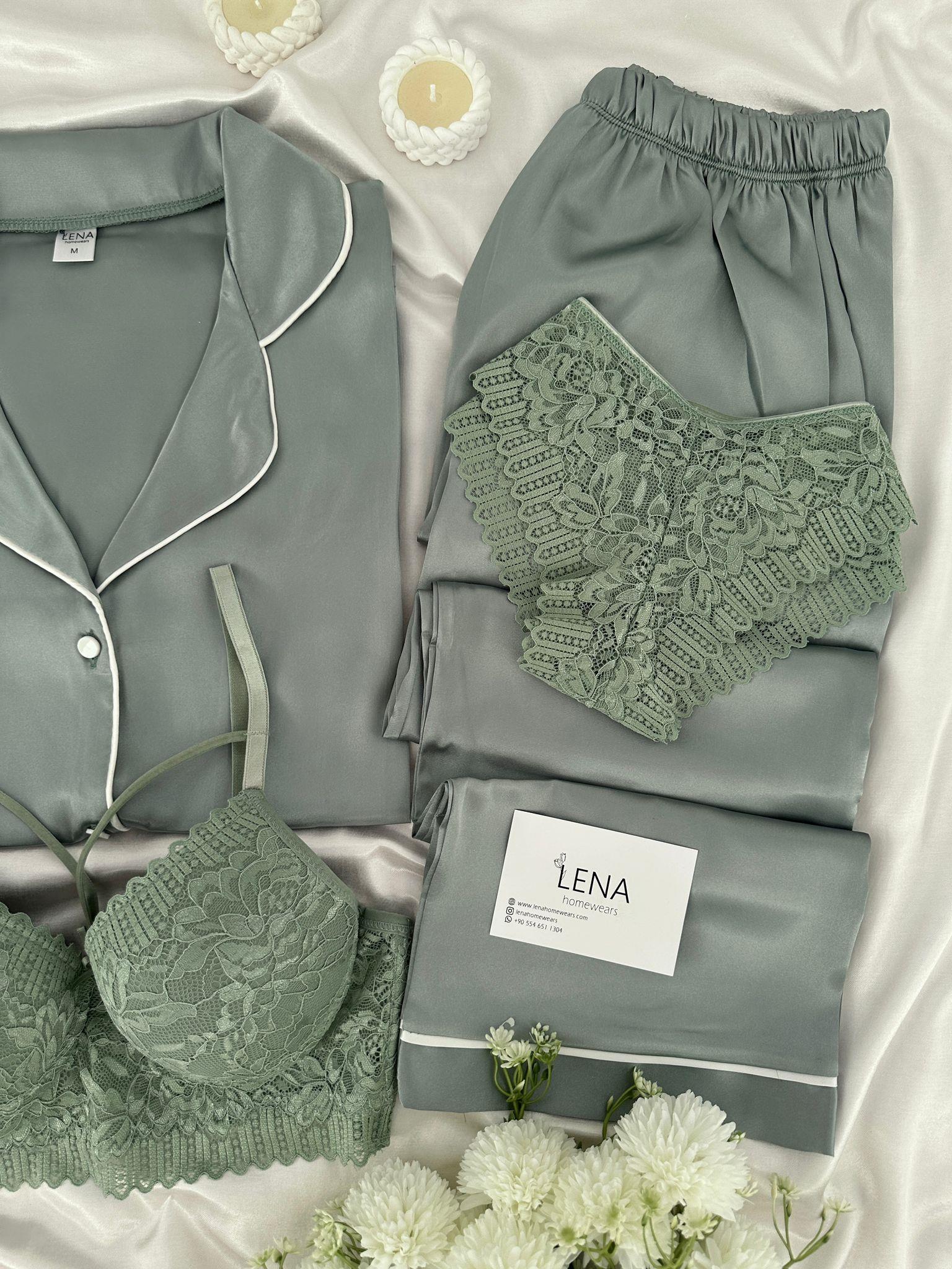 Yumuşacık ipeksi saten düğmeli Kısa kollu üst ve uzun paçalı alt pijama takımı