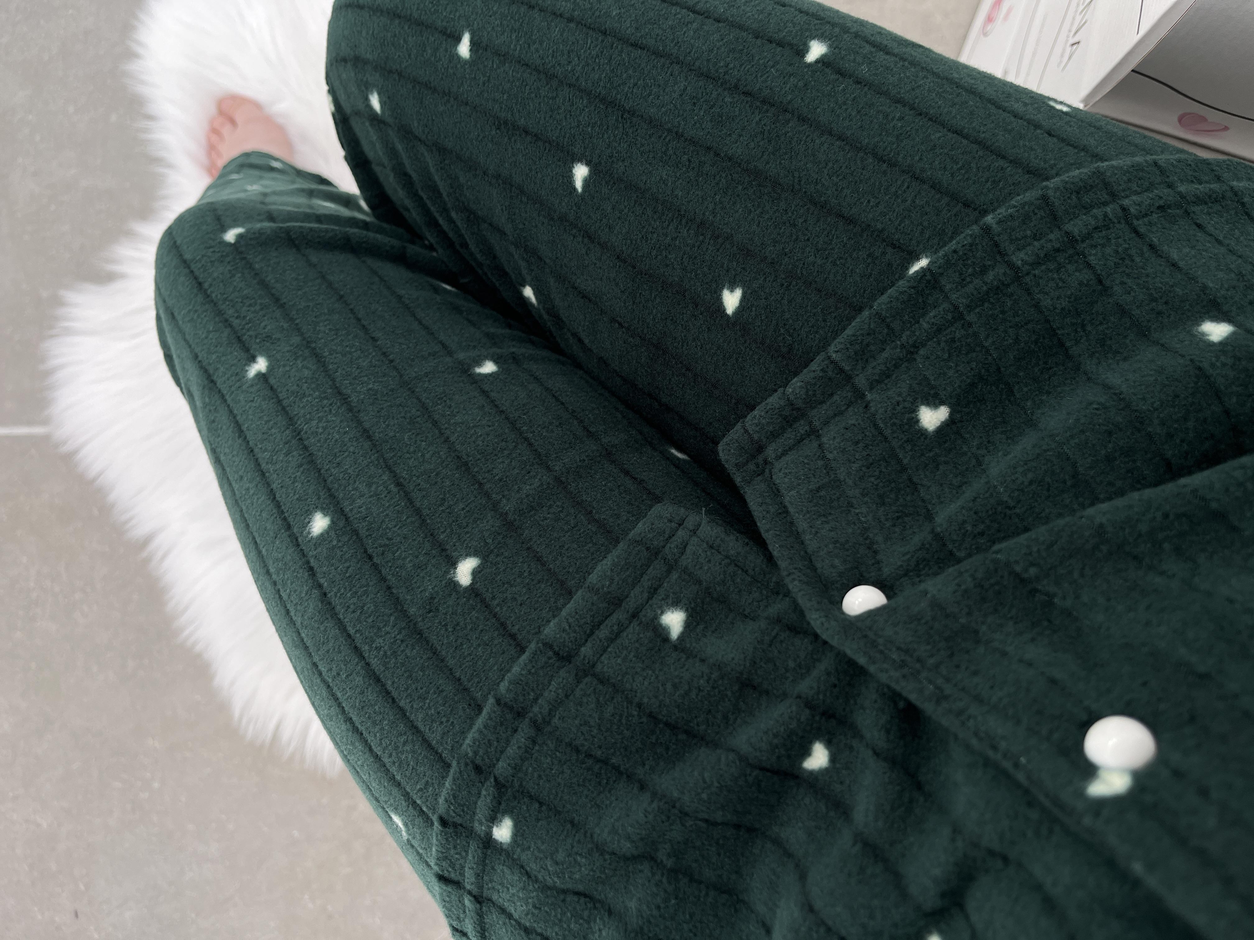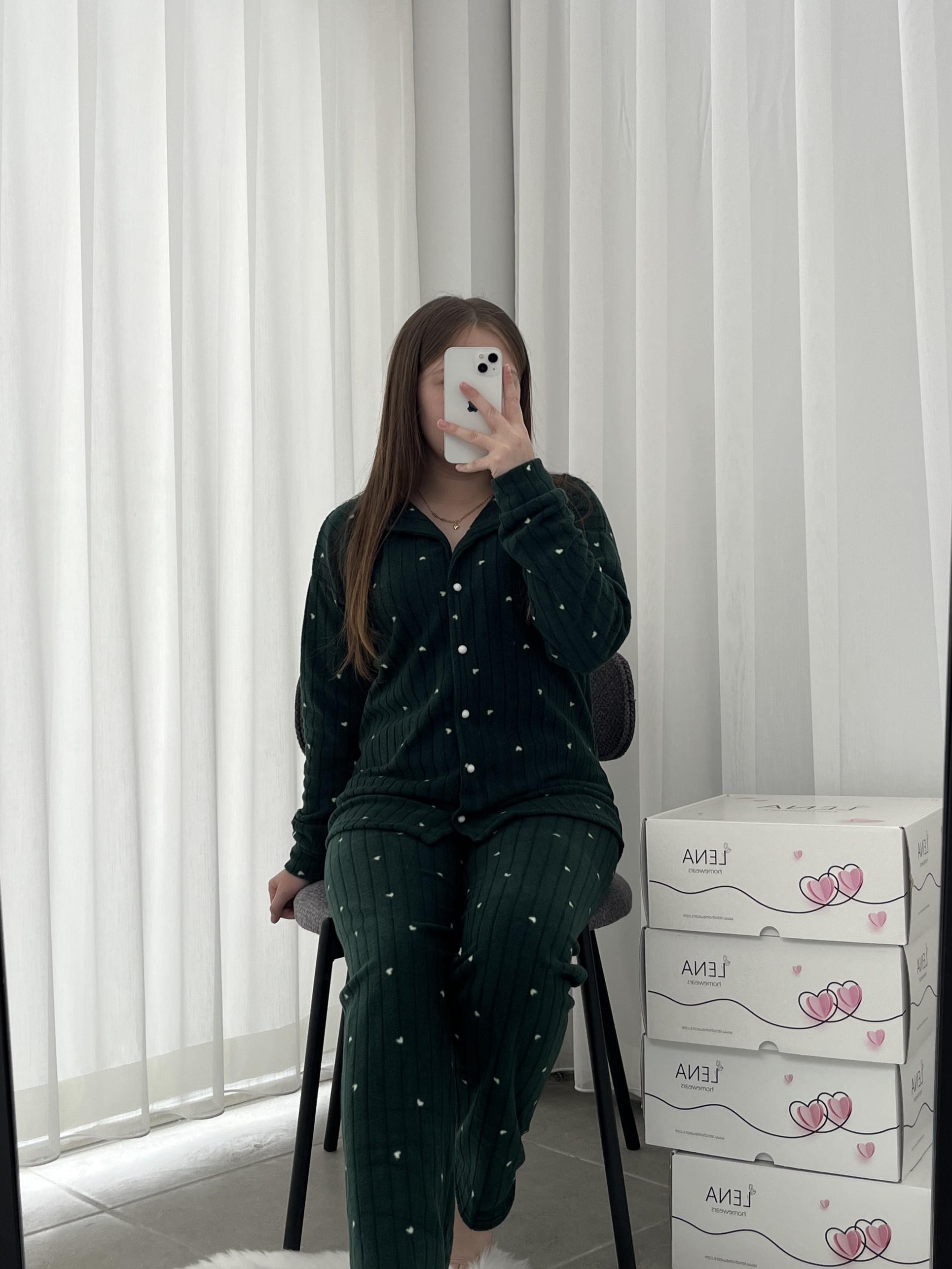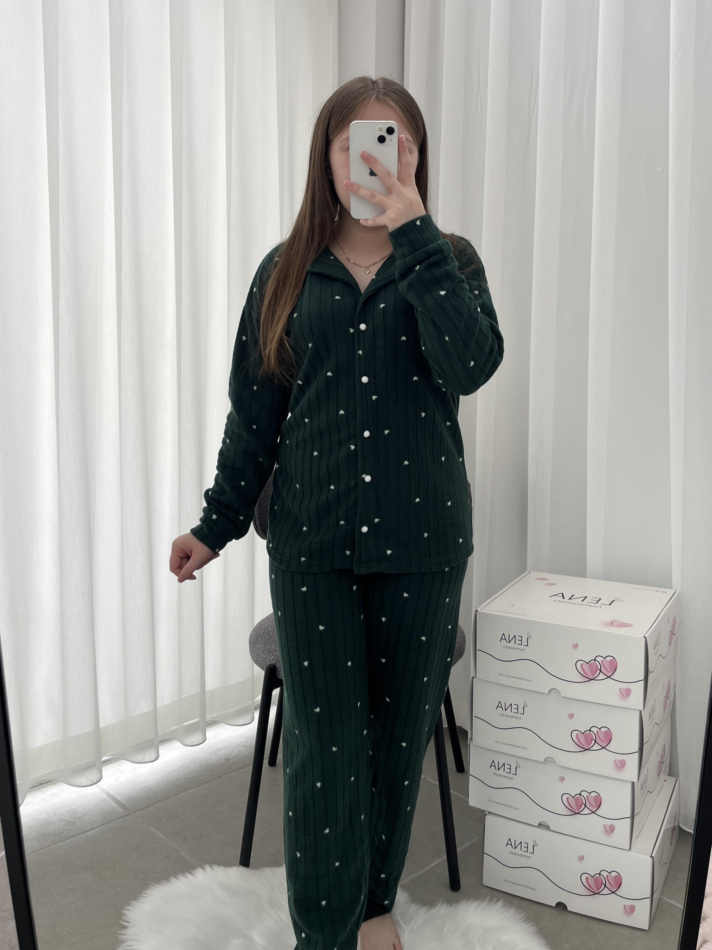Uzun kollu uzun paçalı boydan düğmeli, kapüşonlu fitilli polar takım