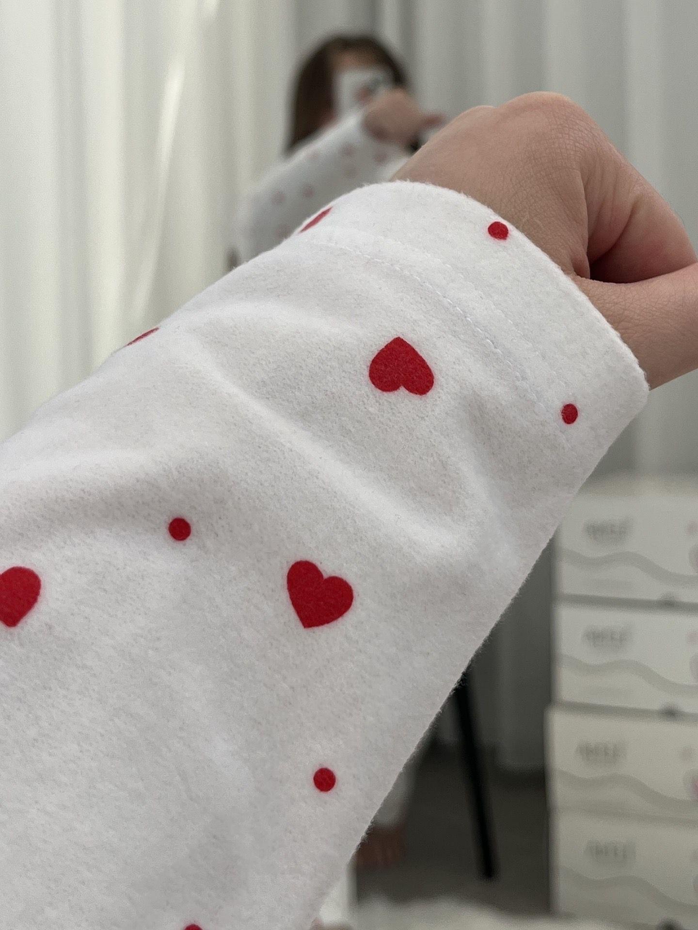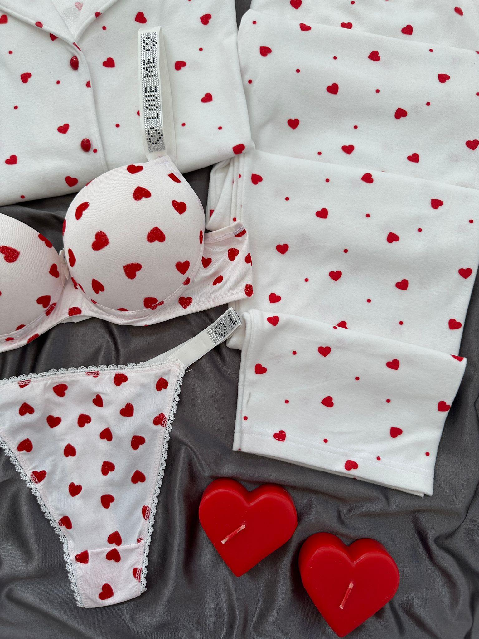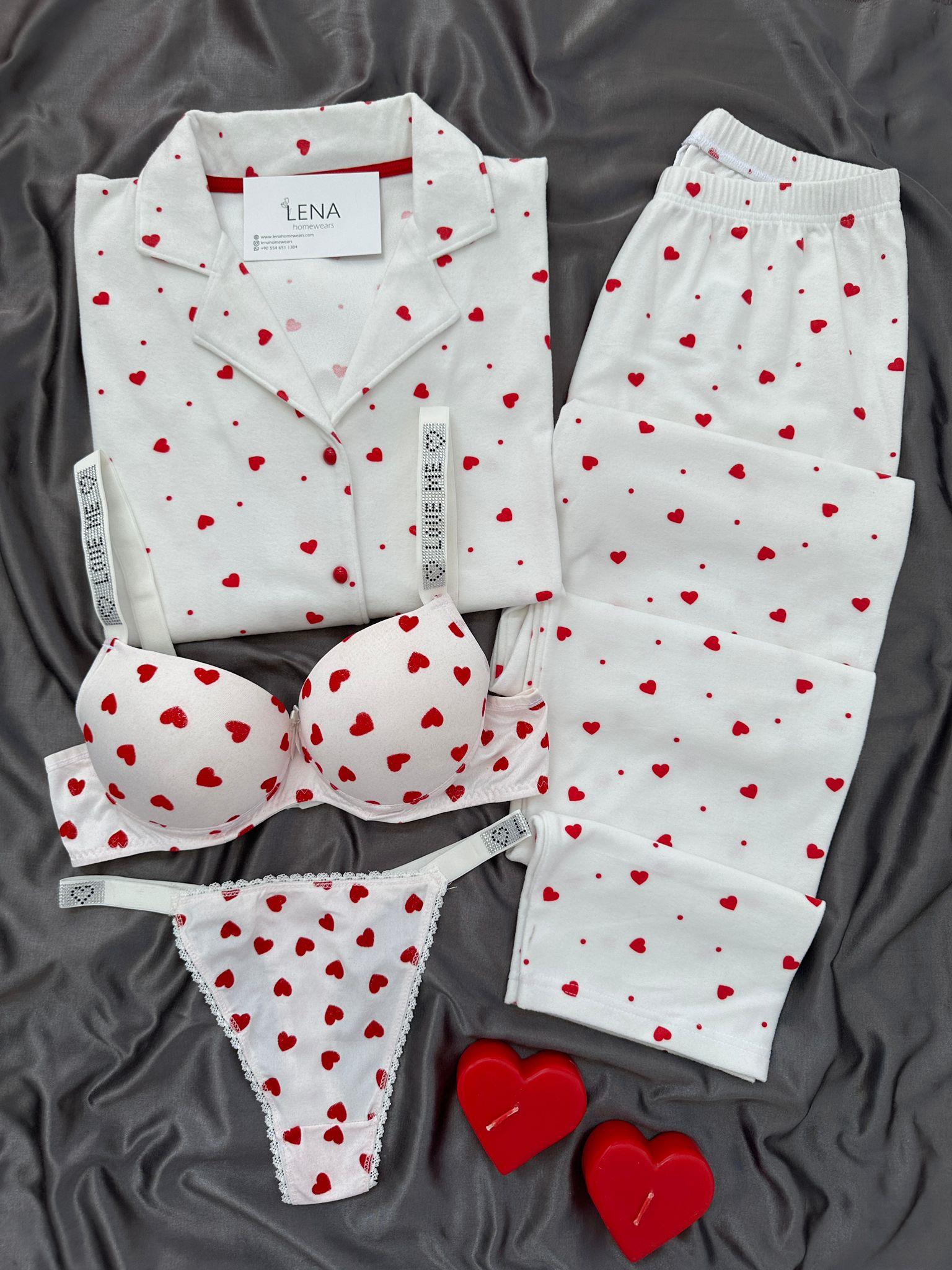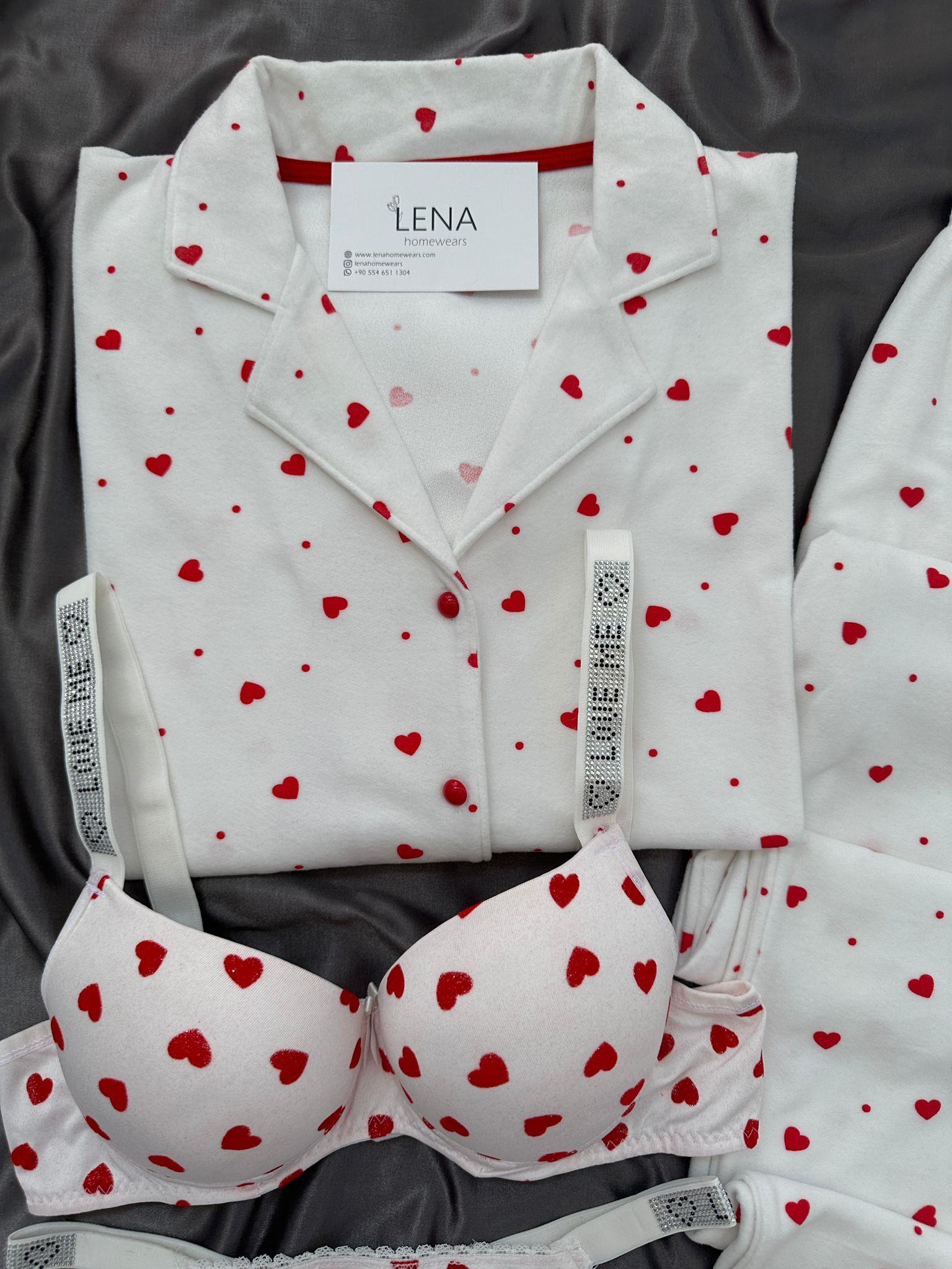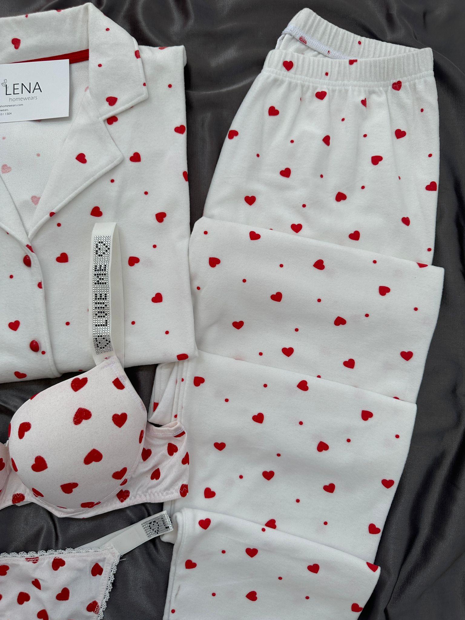 Çok Romantik ✨Yeni Sezon ✨Termosoft Yumuşacık ve sıcacık dokusuyla kırmızı kalp desenli düğmeli uzun kollu uzun paçalı pijama takımı Kalp desenli taş detaylı destekli sütyen takımı ile birlikte ✨