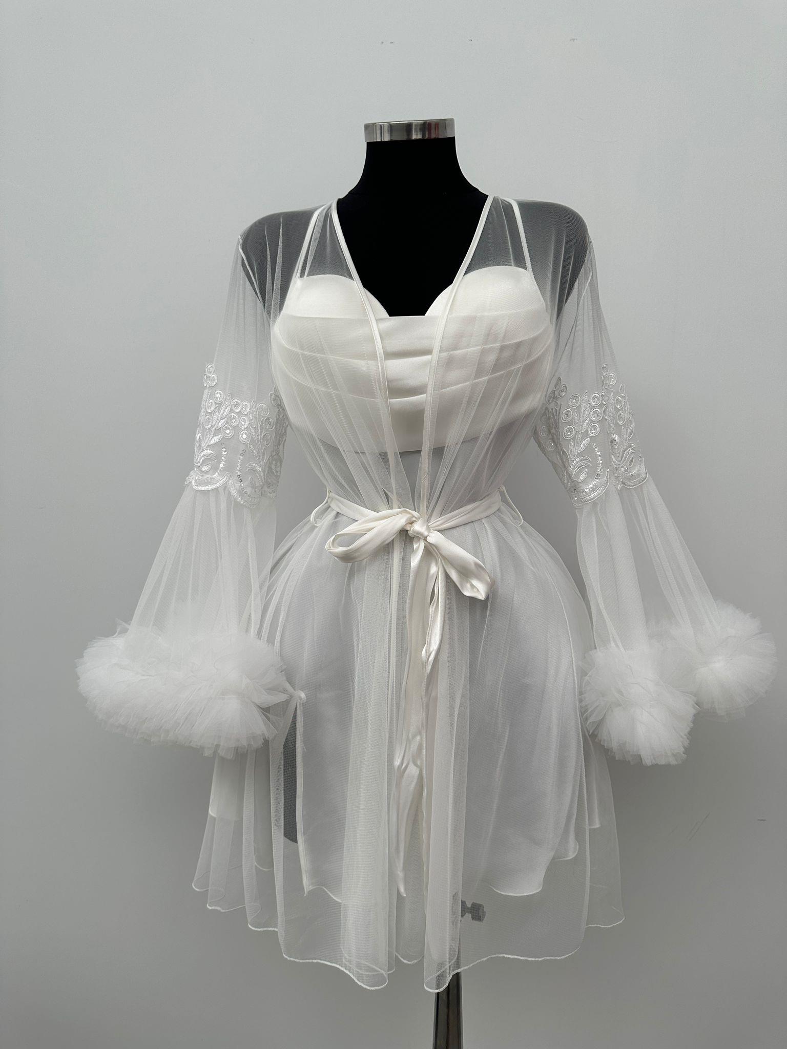Saten göğüs kaplı, ayarlanabilir askılı ve yırtmaç detaylı özel tasarım Kısa gecelik ile birlikte transparan tül işleme detaylı, bağcıklı Kısa sabahlıktan oluşur. El işlemeli Tül sabahlık sayesinde lüks bir görünüme sahiptir. Zarif tasarımı ve yüksek kalite yalnızca Lenada özel üretilmiştir.