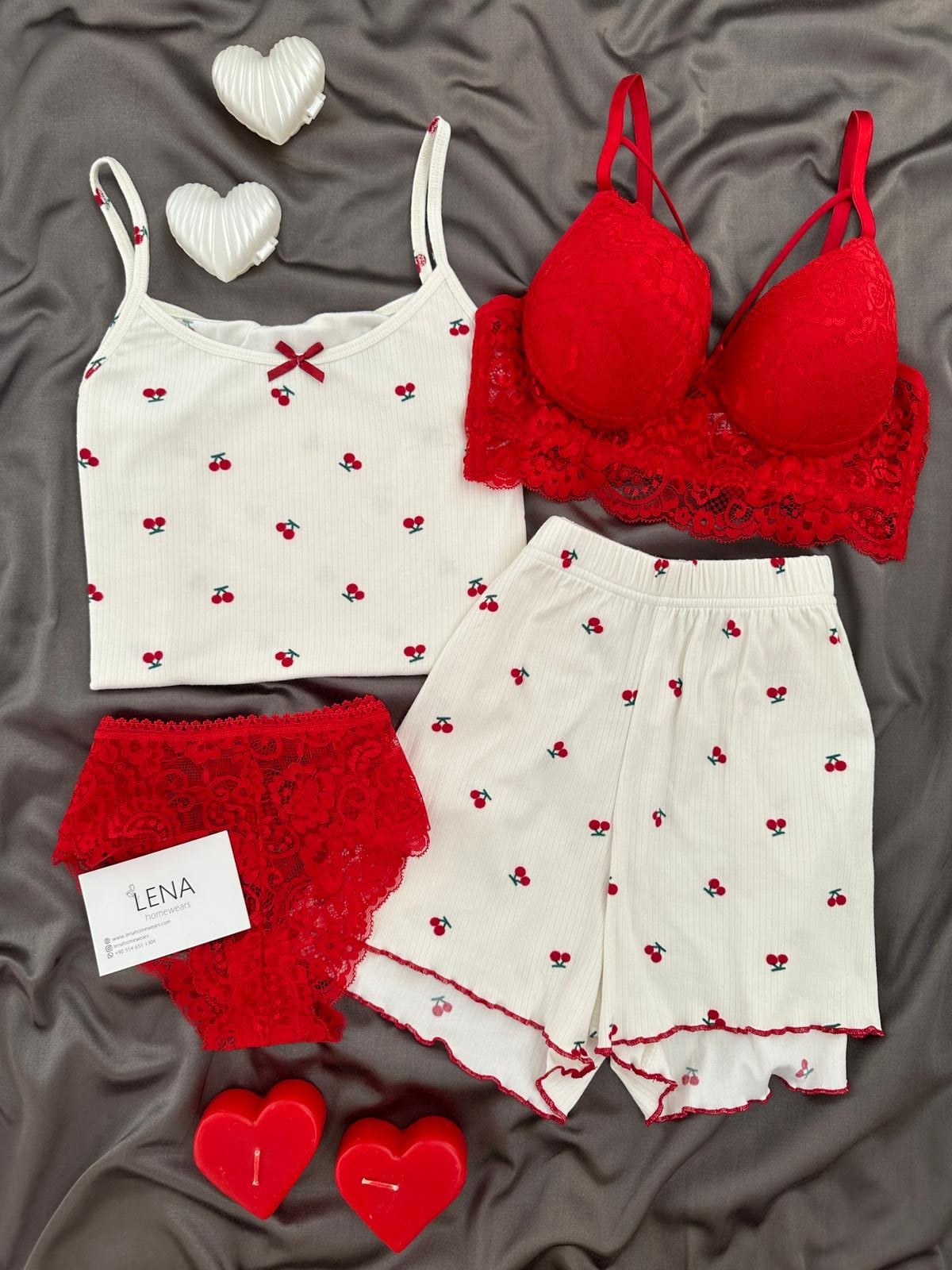 Kiraz Desenli Dörtlü Şortlu Pijama Takımı