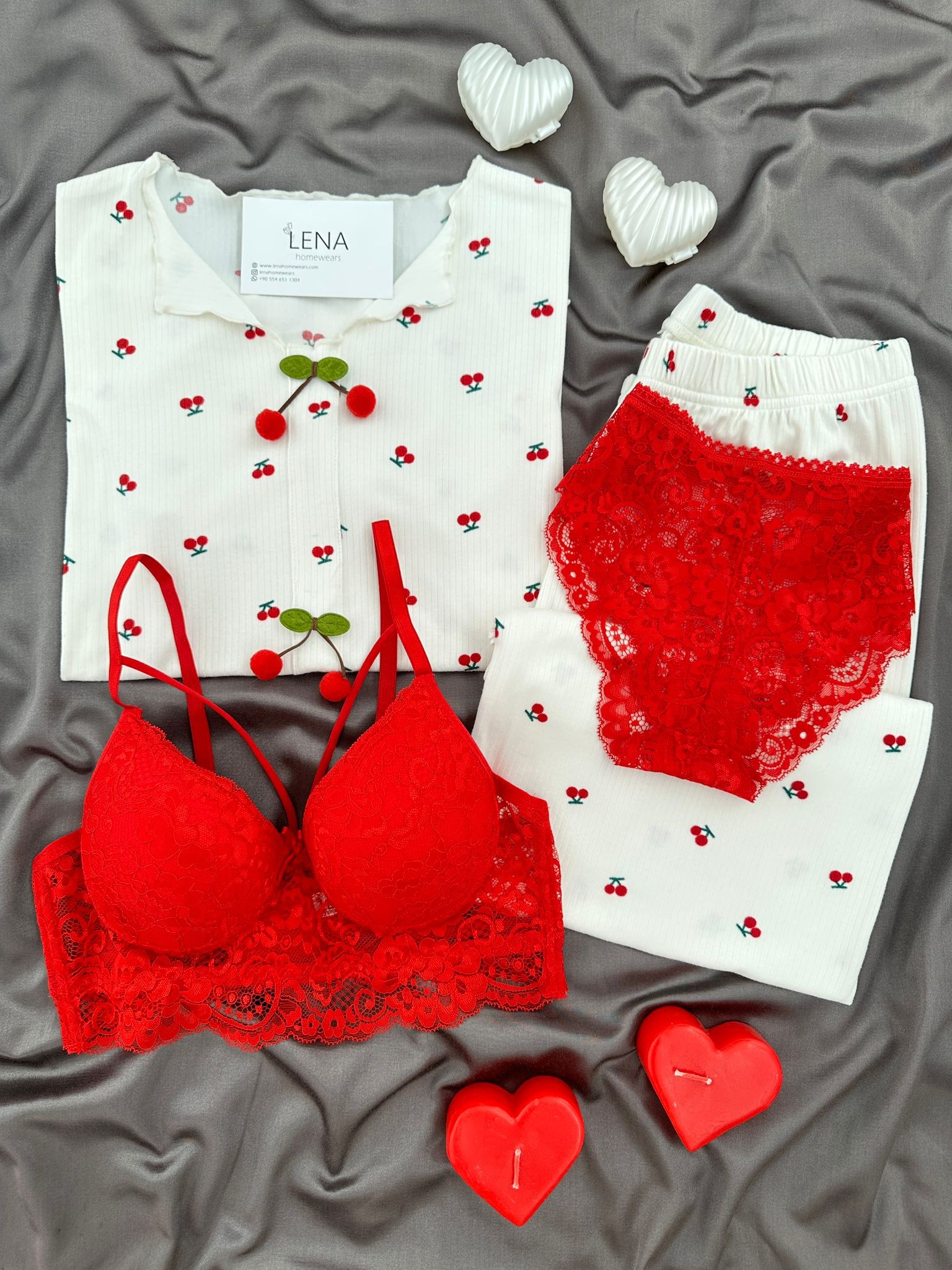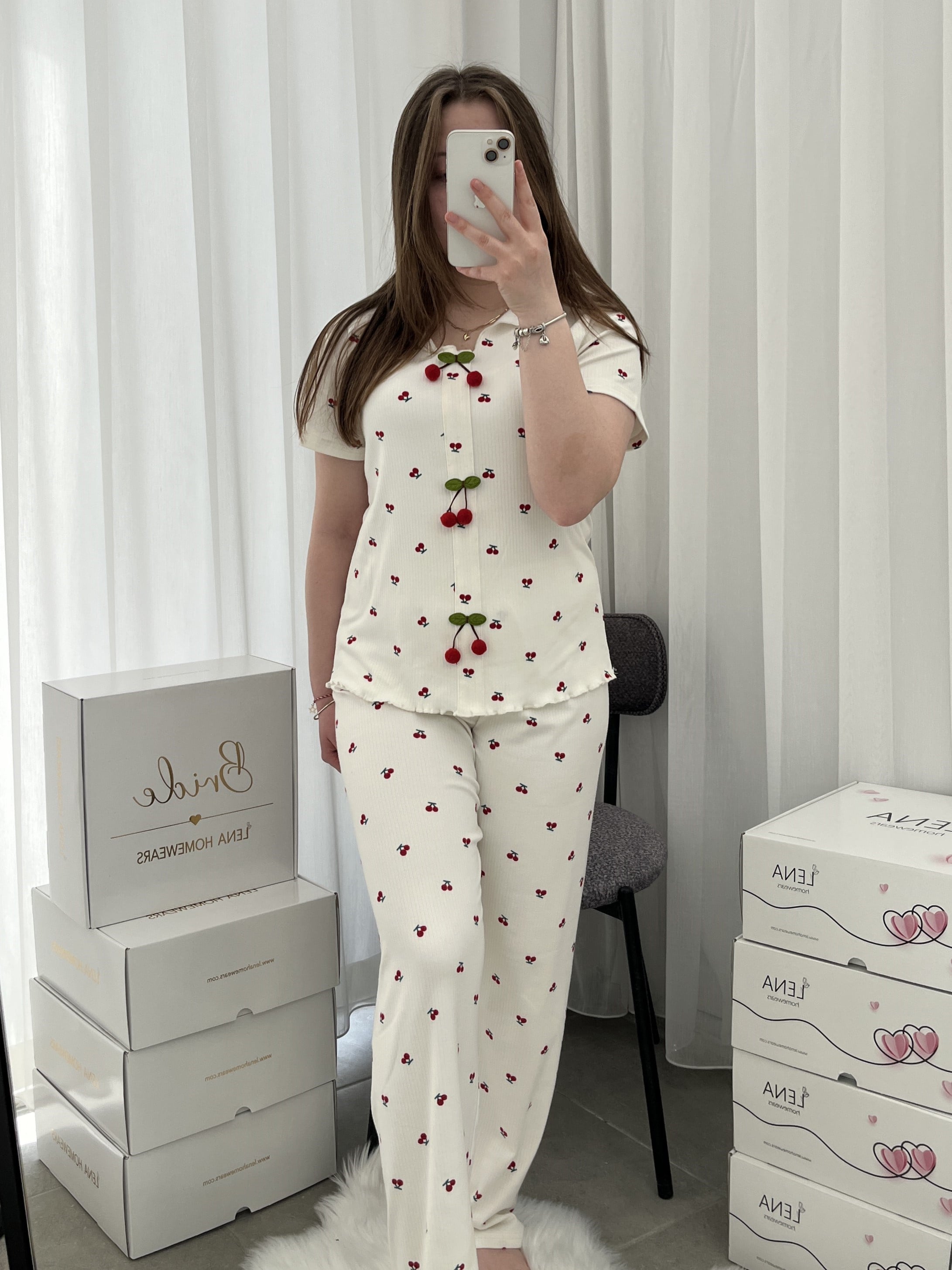 Kiraz Desenli Ekru Oslo Dörtlü Pijama Takımı