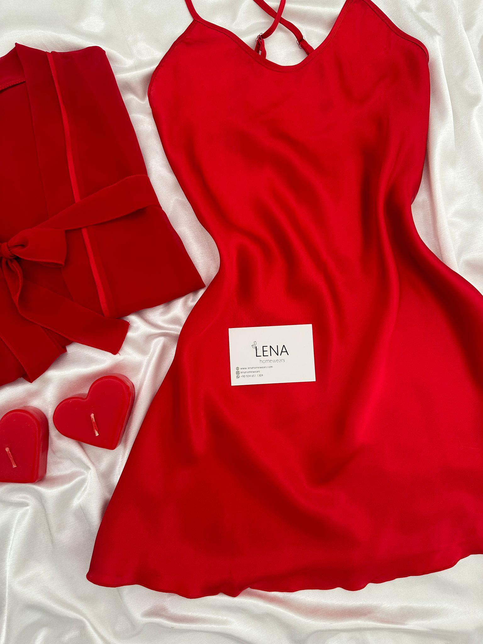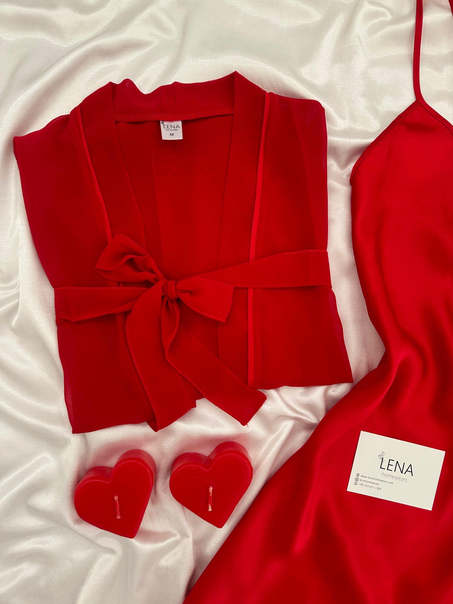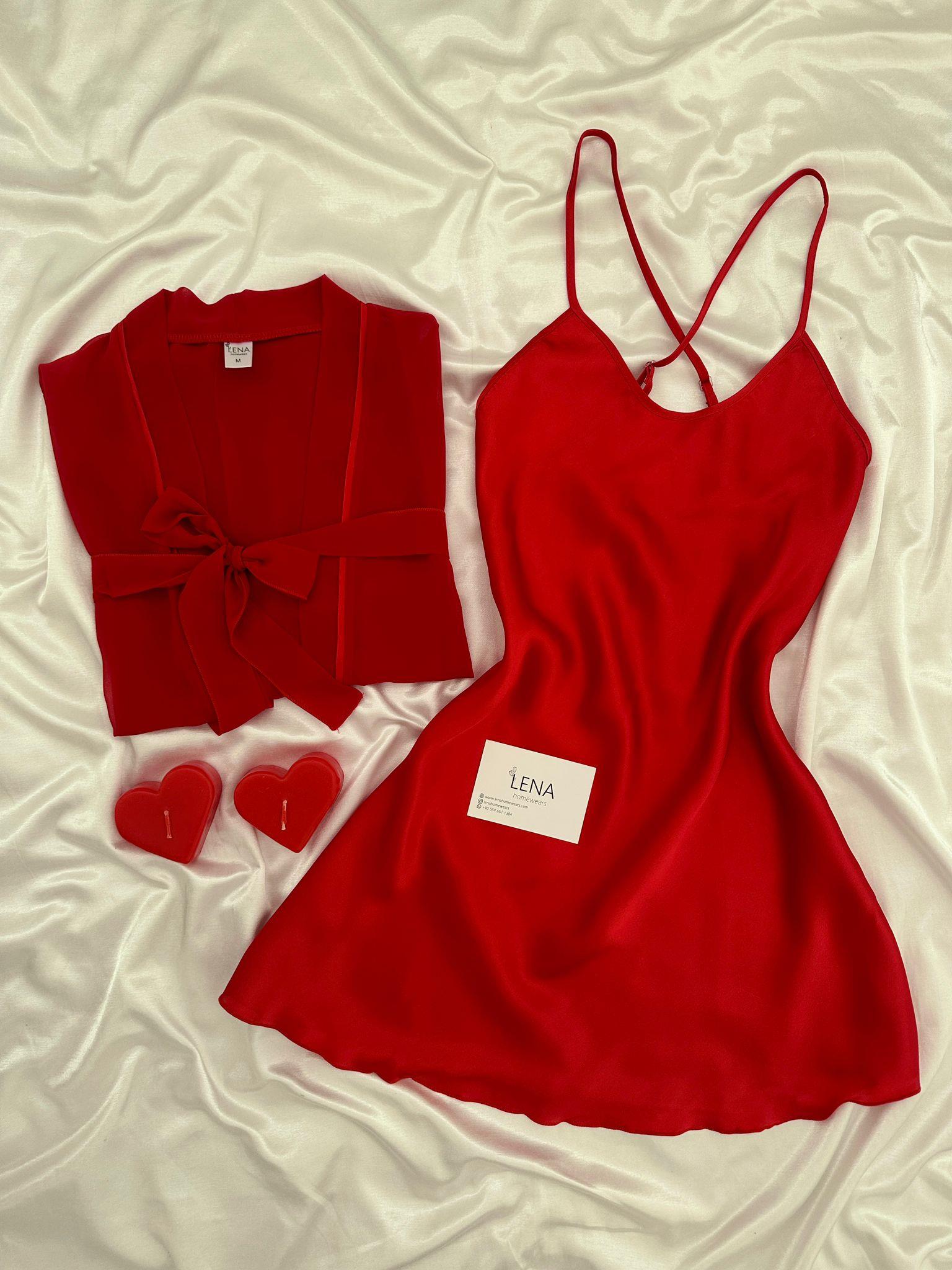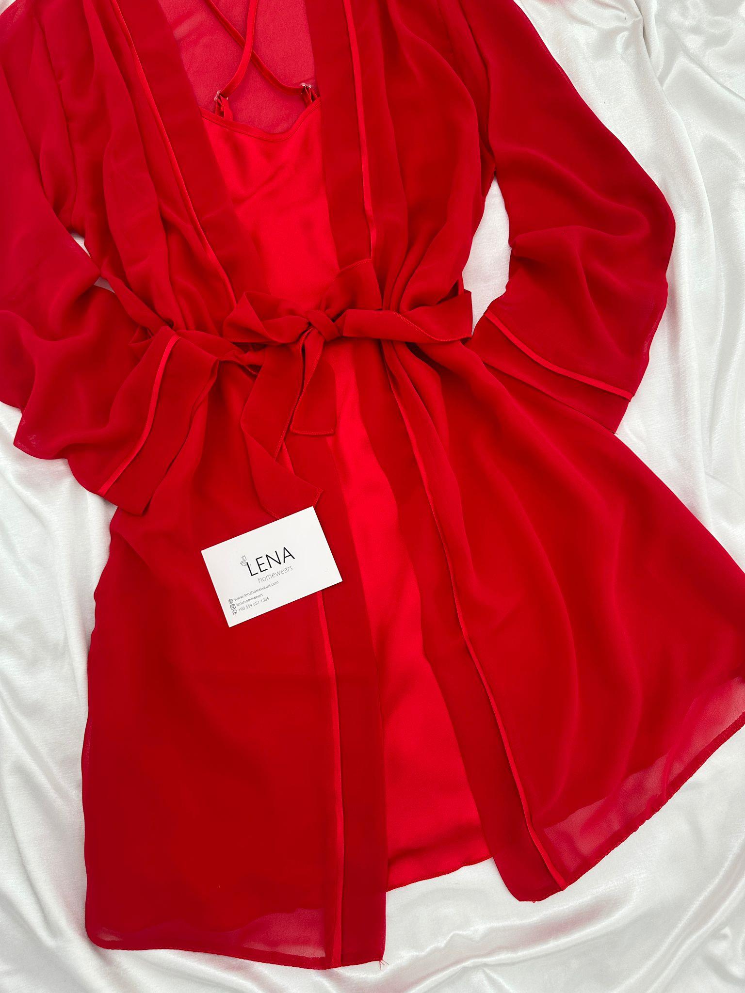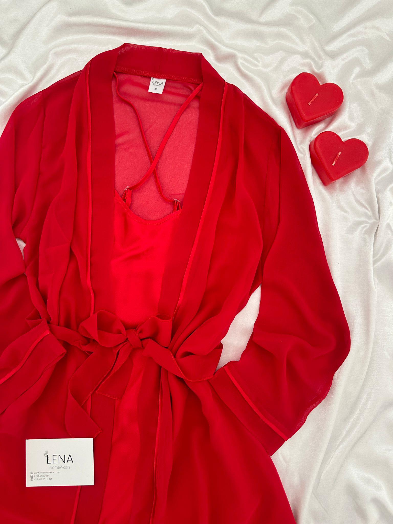 Yeni Sezon ✨ Özel Tasarım Kırmızı şifon biye detaylı kuşaklı sabahlık ve ipeksi saten ayarlanabilir askılı mini gecelik seti