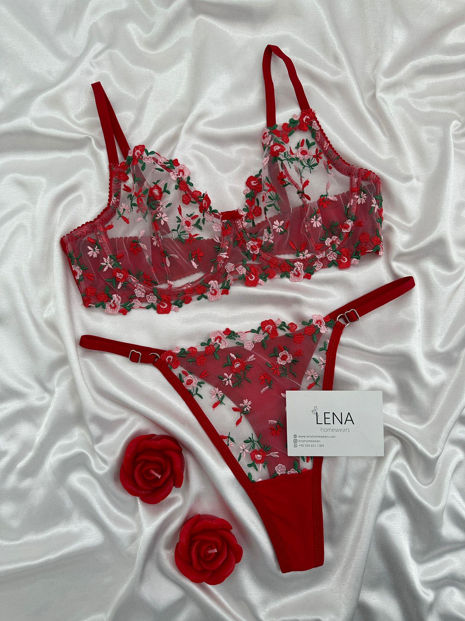 Kırmızı Yeşil çiçek işlemeli Bralet takımı