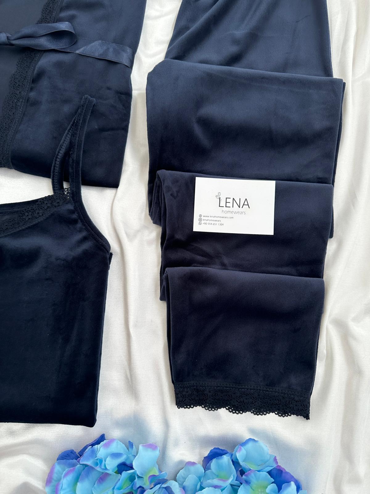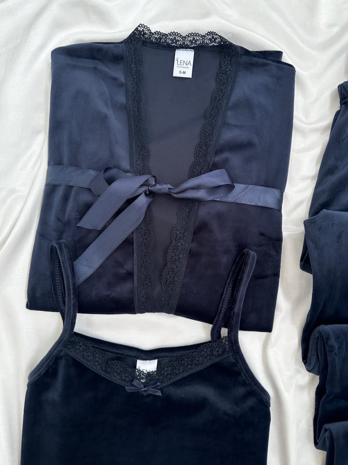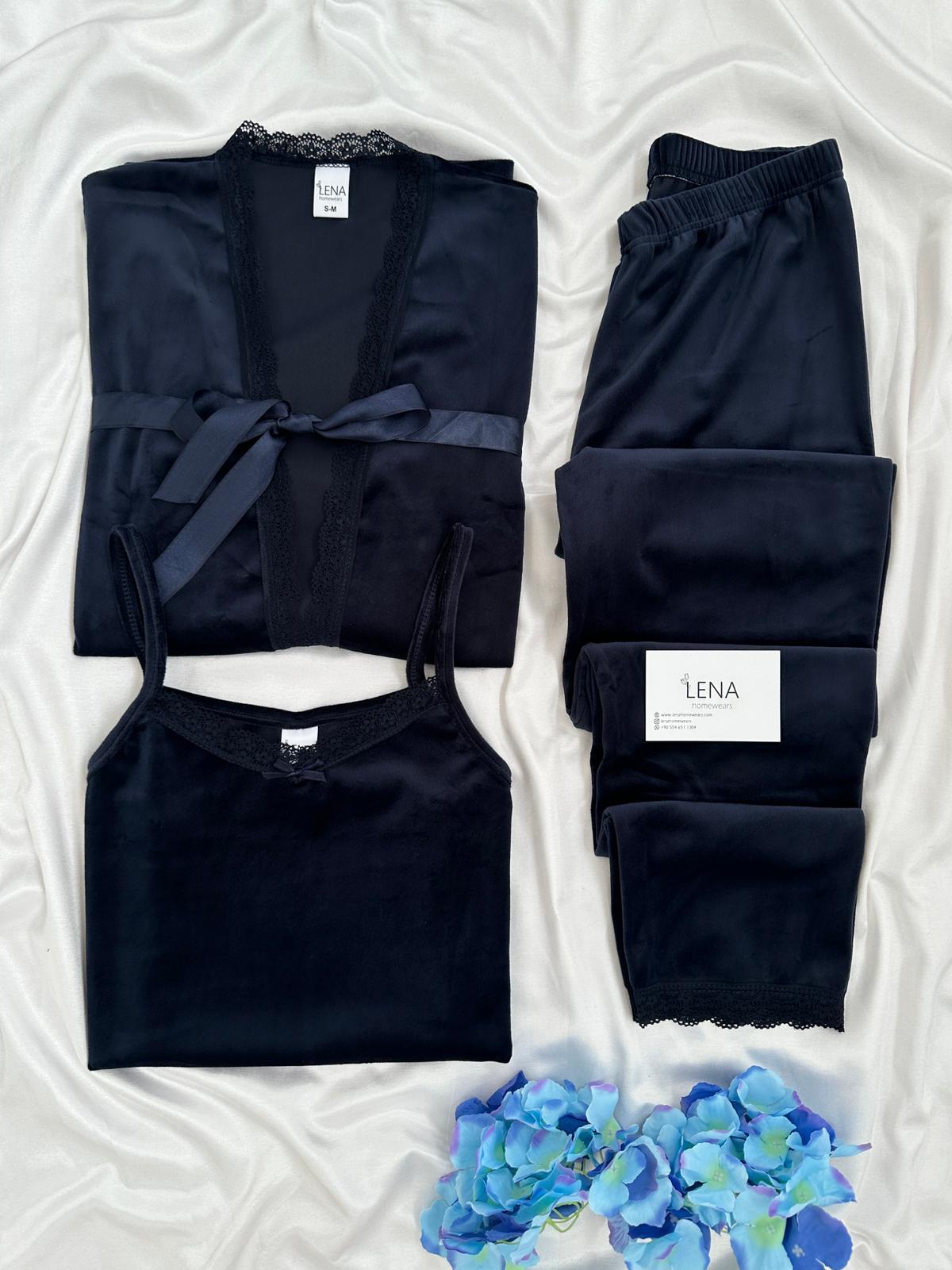 Lacivert Kadife Sabahlıklı Kadın Pijama Takımı