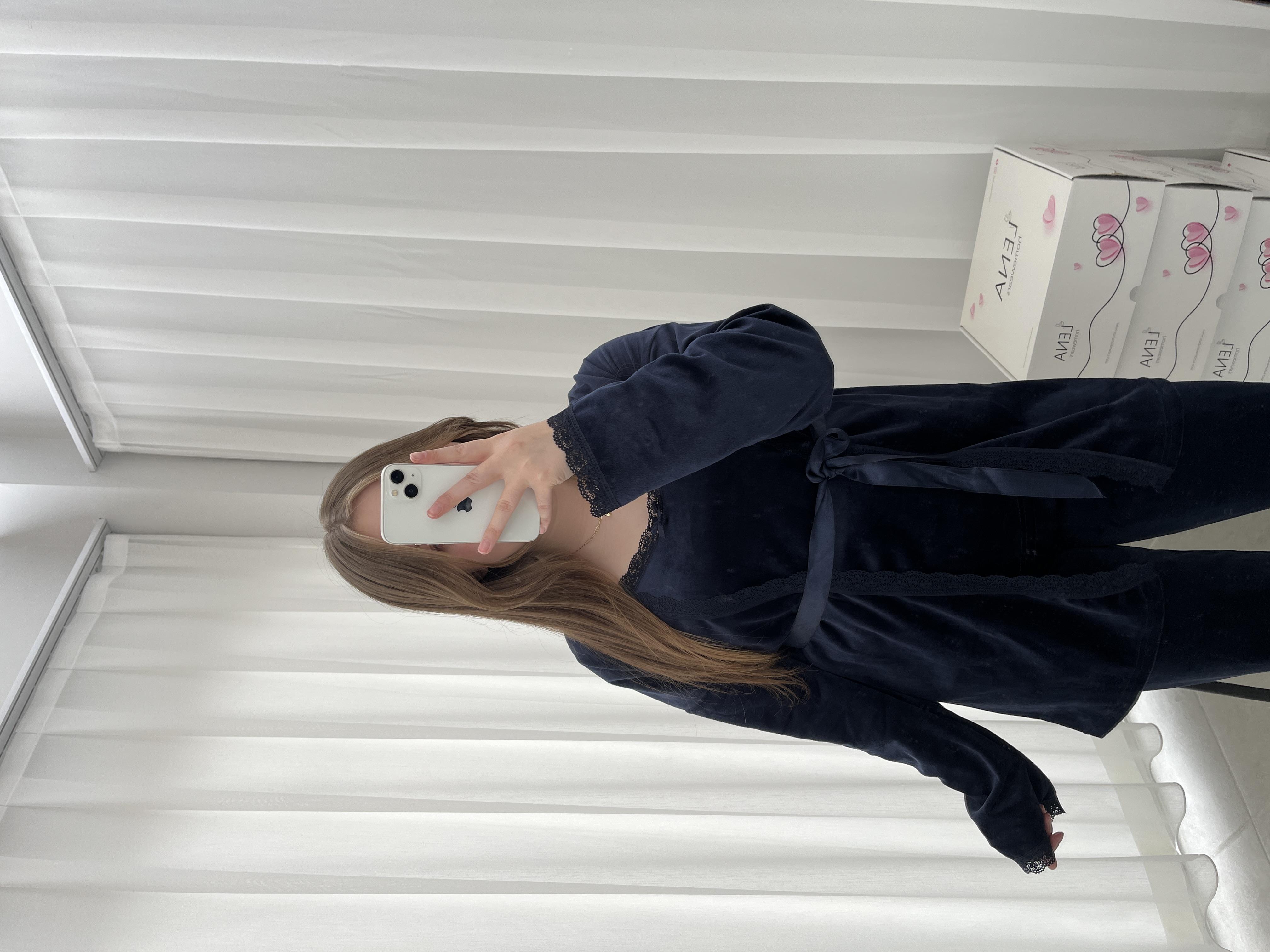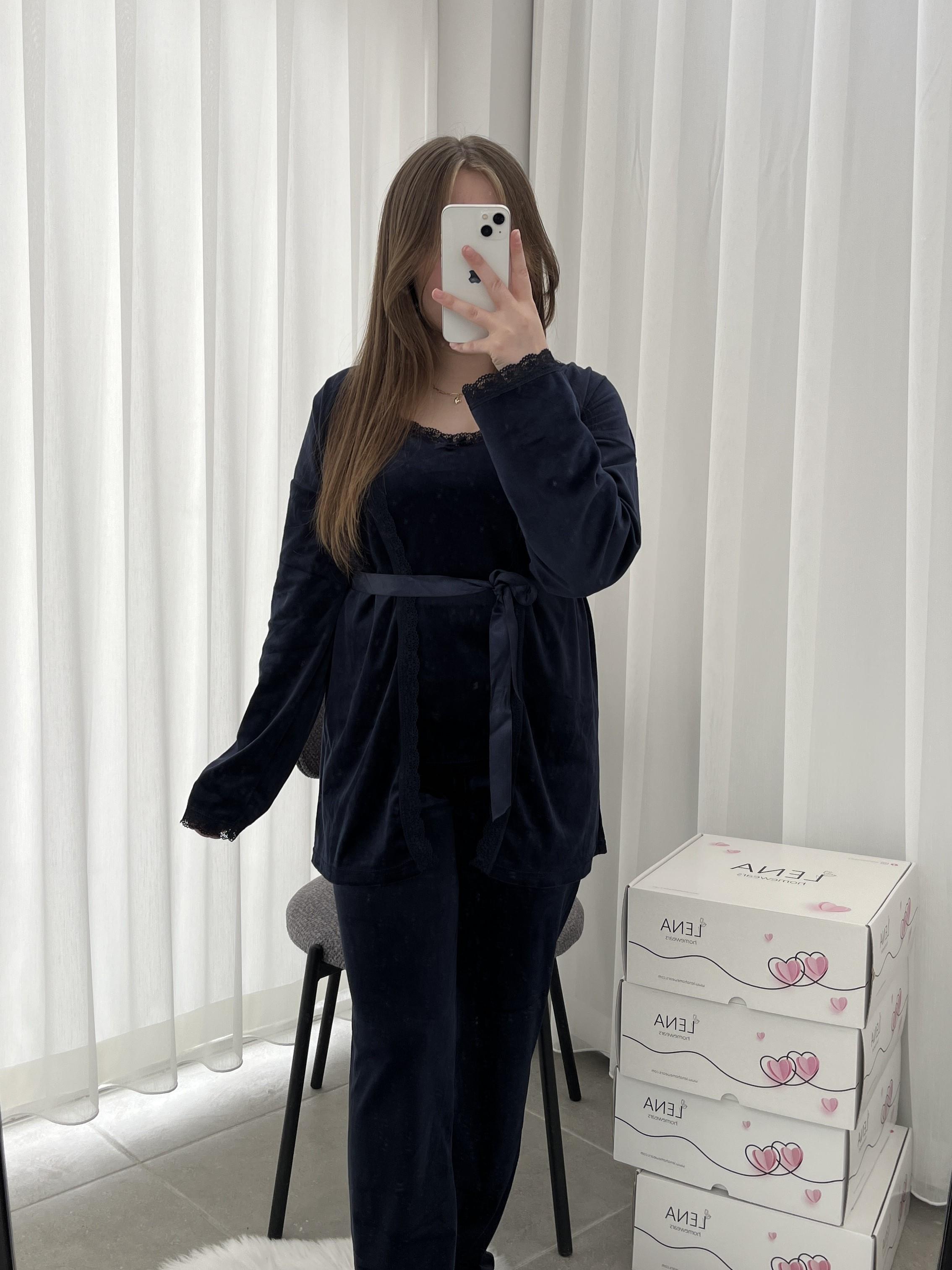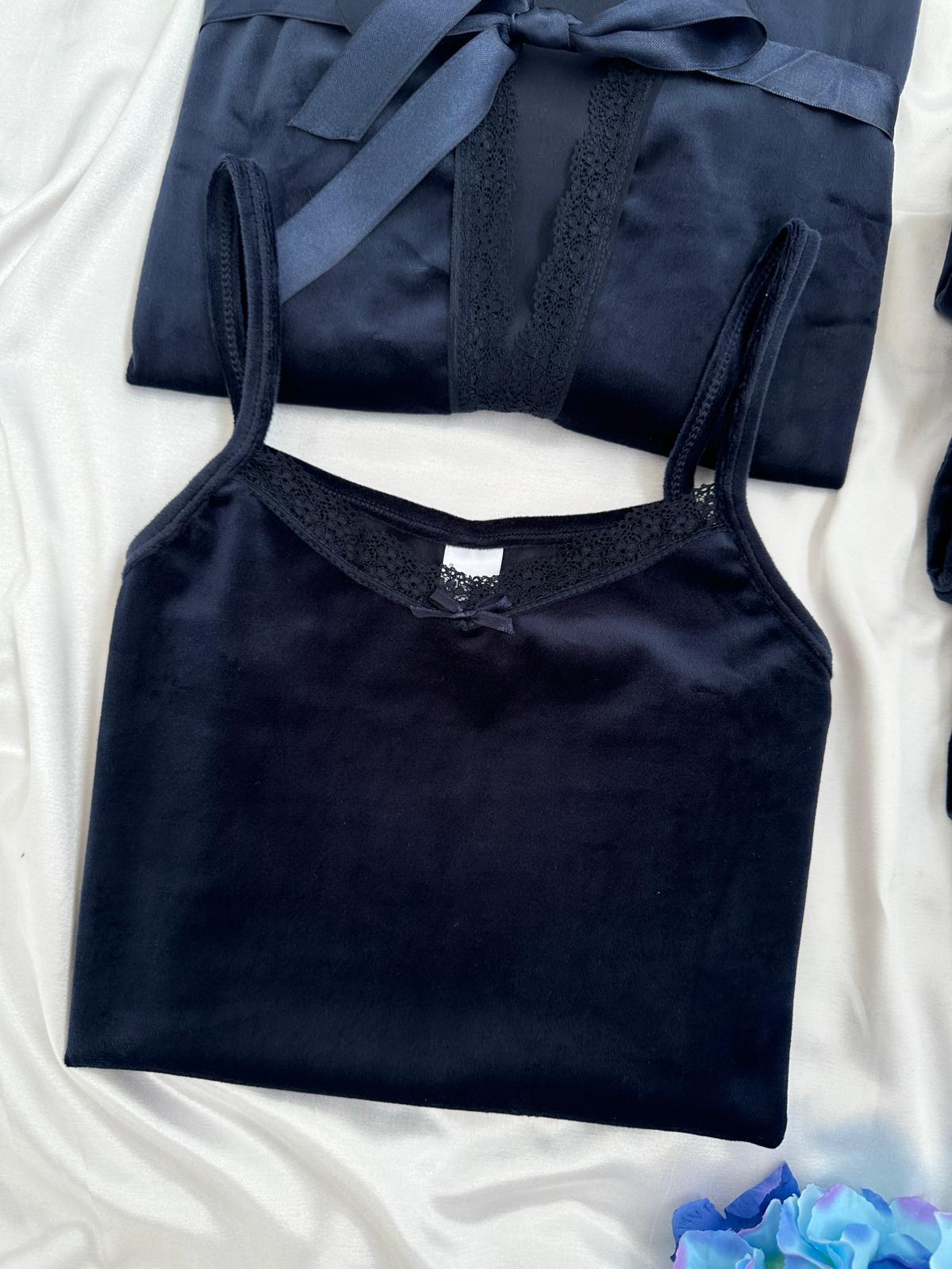 Lacivert Kadife Sabahlıklı Kadın Pijama Takımı