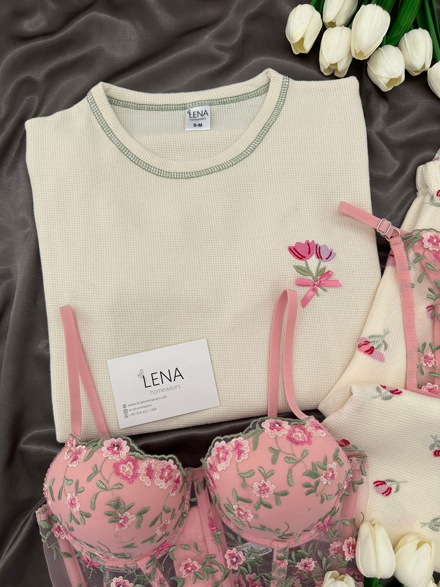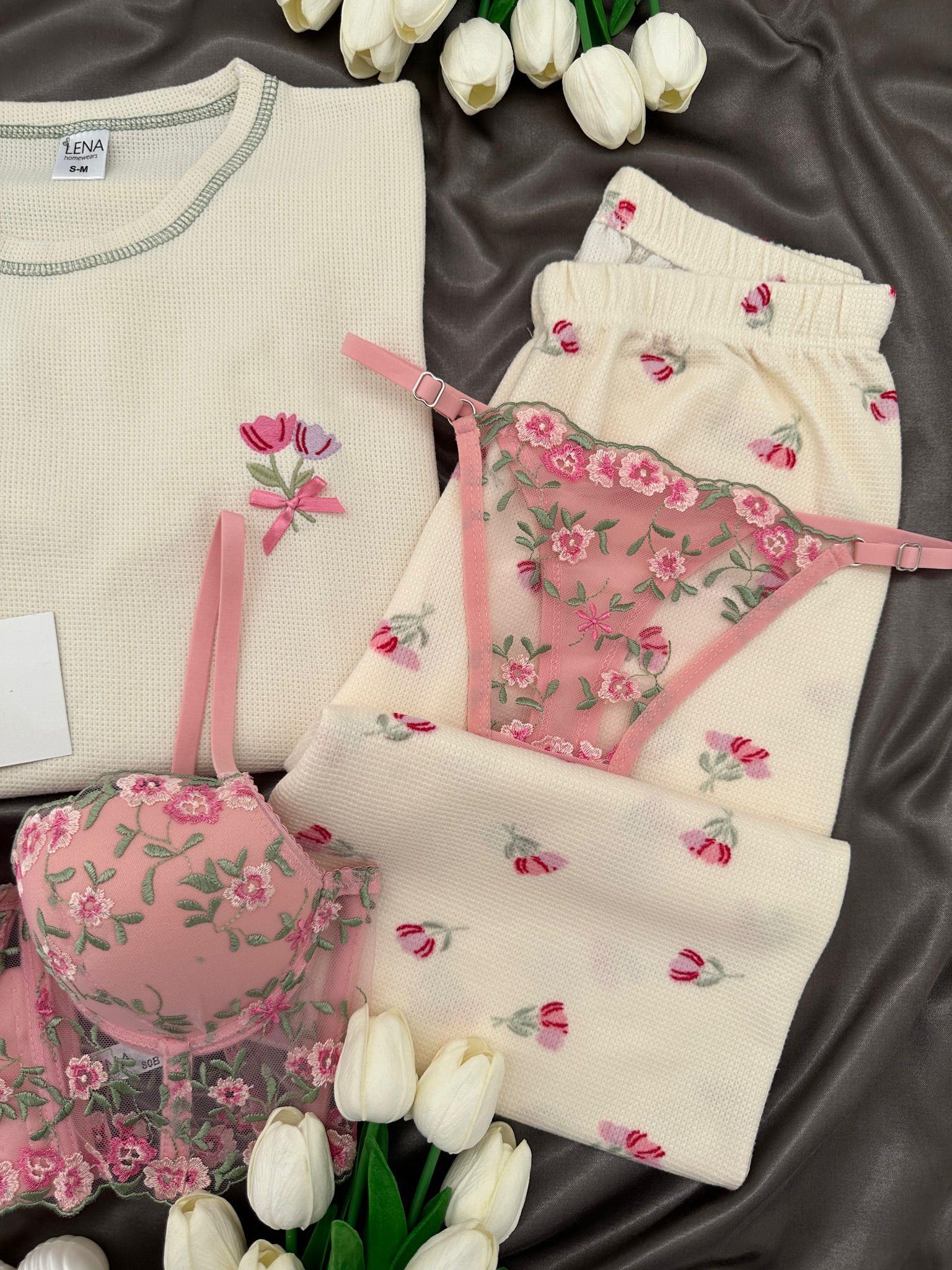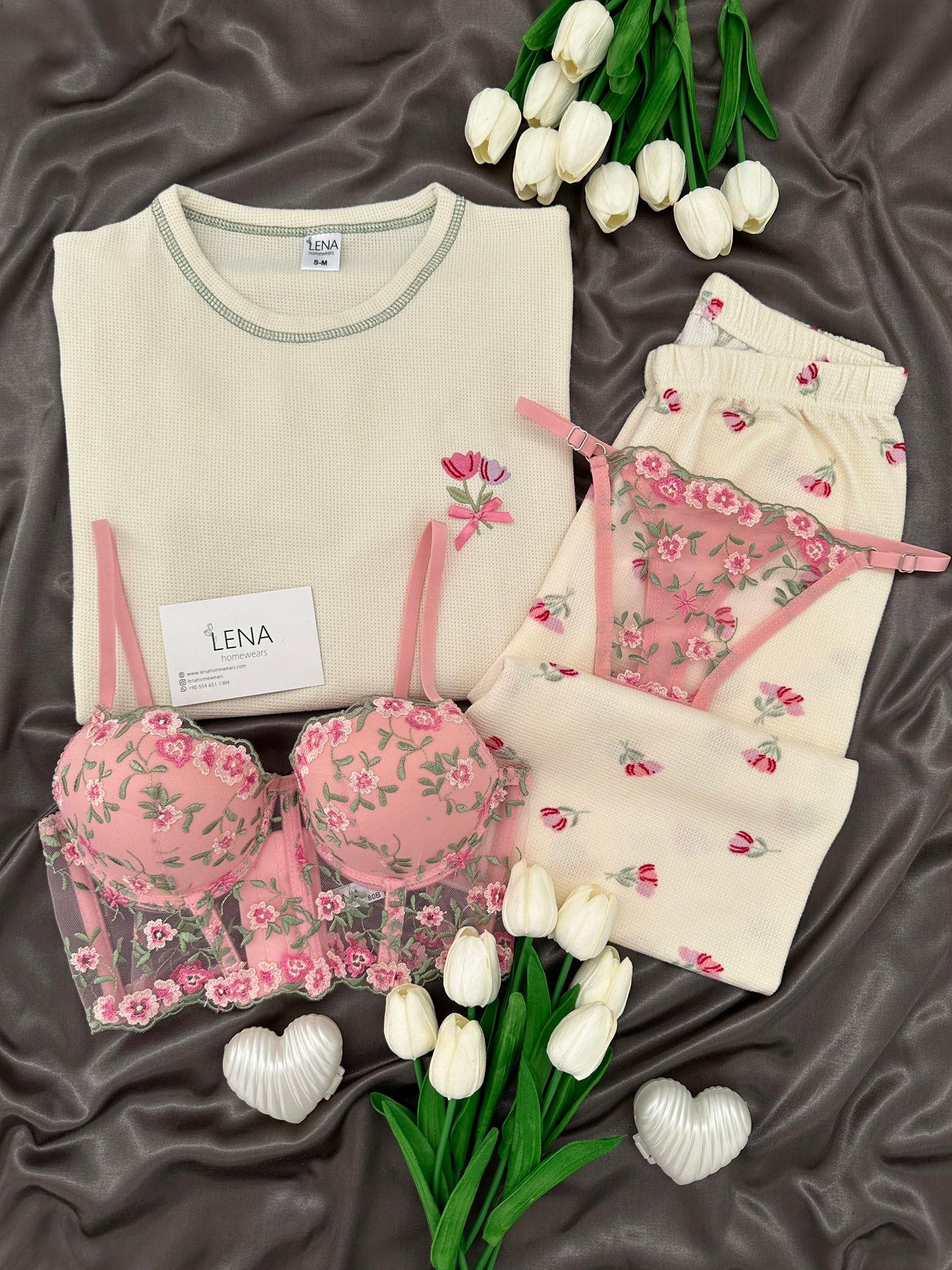 Özel üretim waffle kumaş 👌 Uzun kollu uzun paçalı yumuşacık sıcak tutan ama bunaltmayan yeni waffle kumaş pijama takımı ve destekli korseli ithal çiçek işleme detaylı sütyen takımı ✨ Sm,L,XL,XXL beden / normal kalıp/ waffle kumaş 75-80-85-90 beden / destekli/ bir beden büyük tercih edebilirsiniz