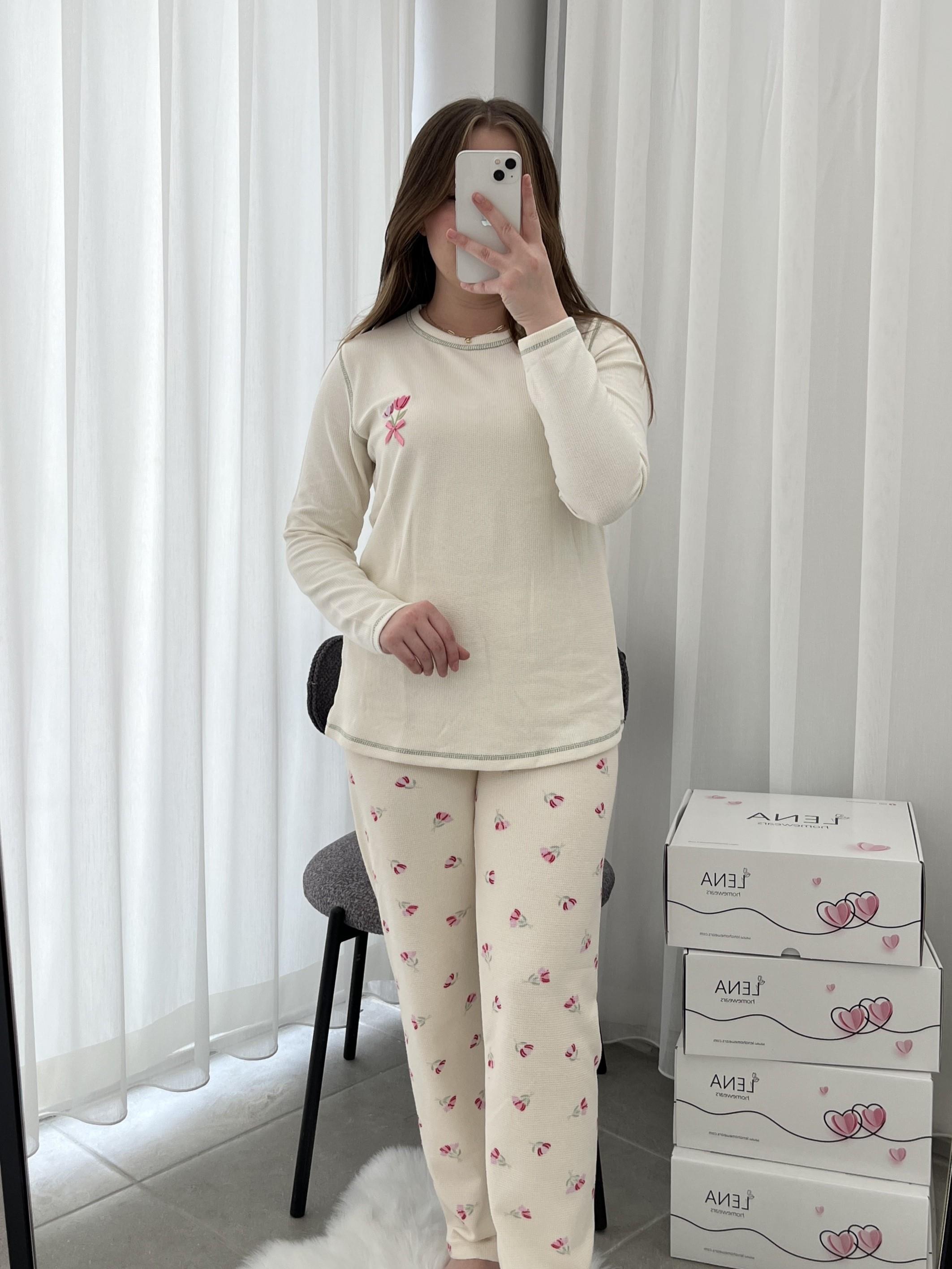 Uzun kollu uzun paçalı yumuşacık sıcak tutan ama bunaltmayan yeni waffle kumaş pijama takımı ve destekli korseli ithal çiçek işleme detaylı sütyen takımı ✨