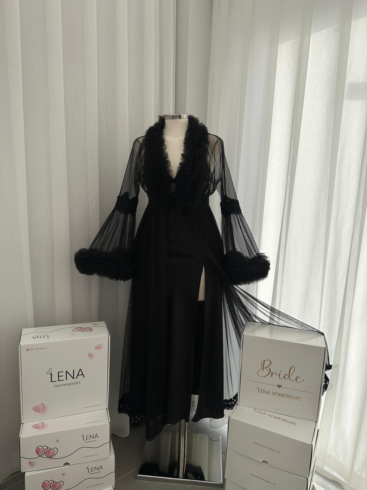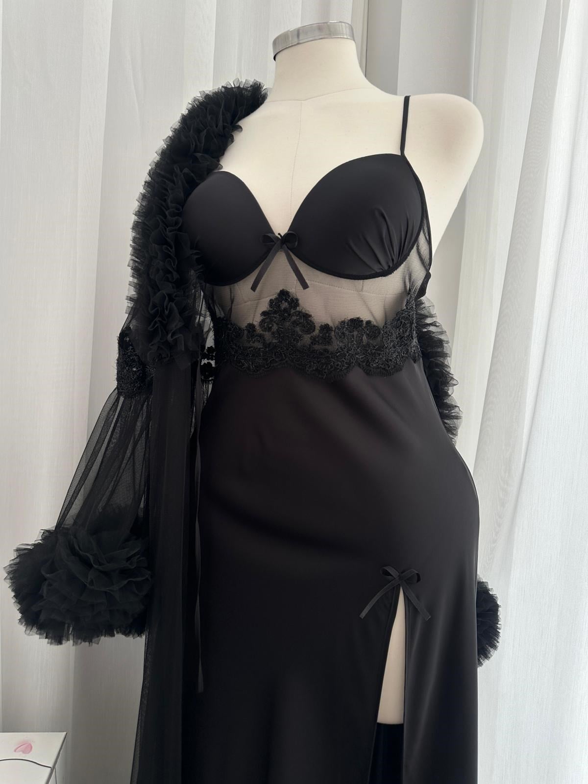 Saten göğüs kaplı, ayarlanabilir askılı ve derin yırtmaç detaylı özel tasarım uzun gecelik ile birlikte transparan tül işleme detaylı, bağcıklı uzun sabahlıktan oluşur. El işlemeli Tül sabahlık sayesinde lüks bir görünüme sahiptir. Zarif tasarımı ve yüksek kalite  yalnızca Lenada  özel üretilmiştir.