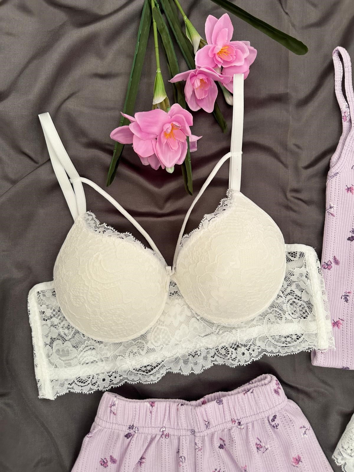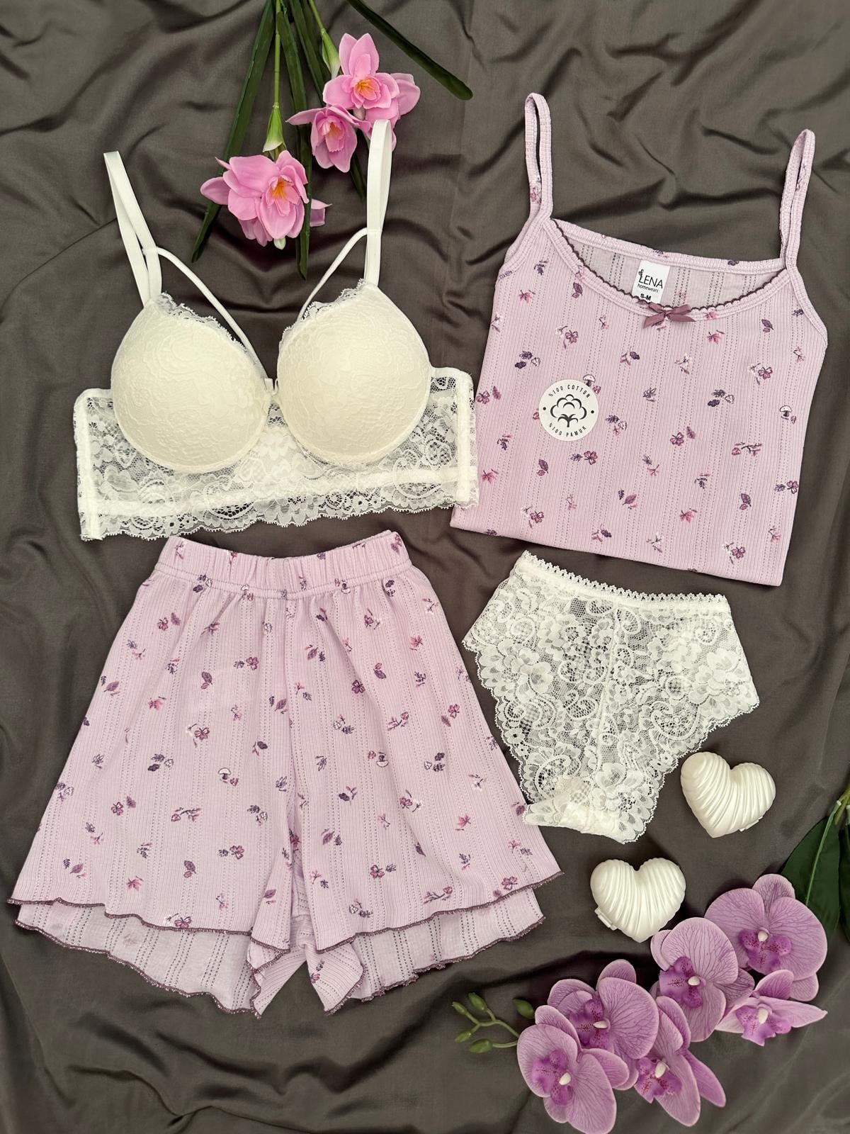 %100 pamuklu transfer baskı kumaşı sayesinde nefes alabilen, hafif ve cilt dostu yapısı ile gün boyu konfor sunar. Terletmeyen özel dokusu sayesinde özellikle yaz aylarında ferah bir kullanım sağlar. Askılı üst ve şort alt tasarımı ile rahat ve feminen bir görünüm sunarken, esnek yapısı sayesinde hareket özgürlüğü sağlar. Canlı ve kalıcı desen baskısı ile şık bir stil oluşturur. Dayanıklı kumaşı sayesinde tüylenmeye karşı dirençlidir ve formunu uzun süre korur. Ürün içeriğinde Dantel Detaylı Destekli  sütyen ve külot iç çamaşırı takımı da bulunmaktadır.