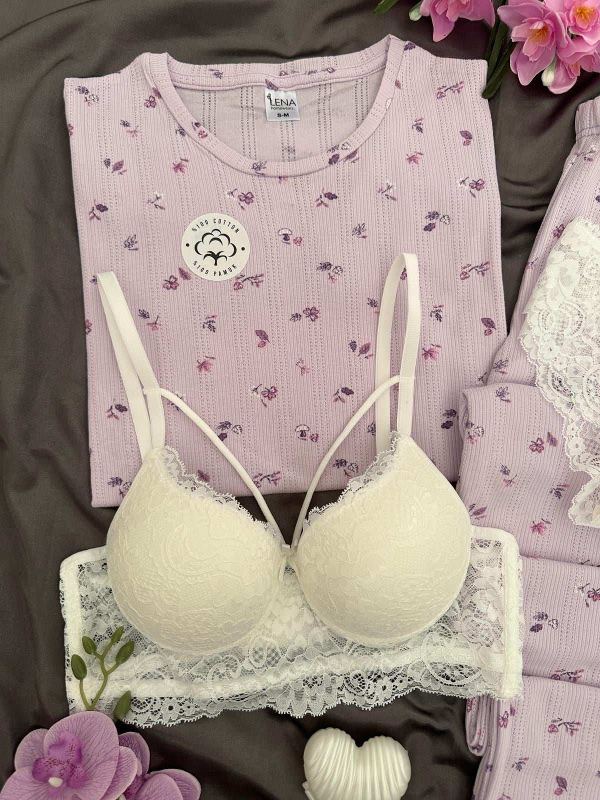 Lila Çiçek desenli Kısa kollu Basic üst, uzun paçalı alt ile birlikte