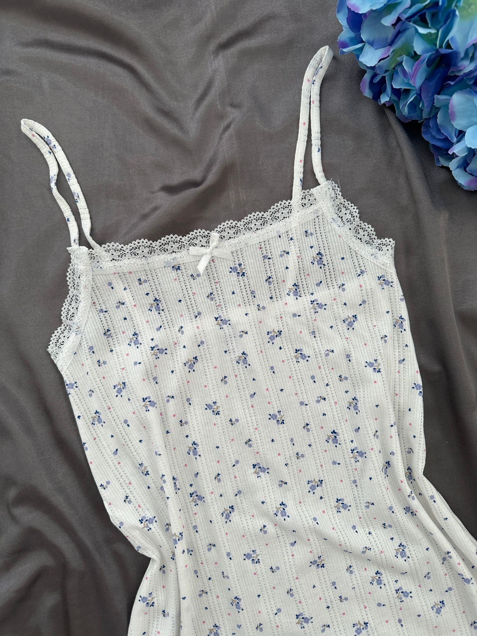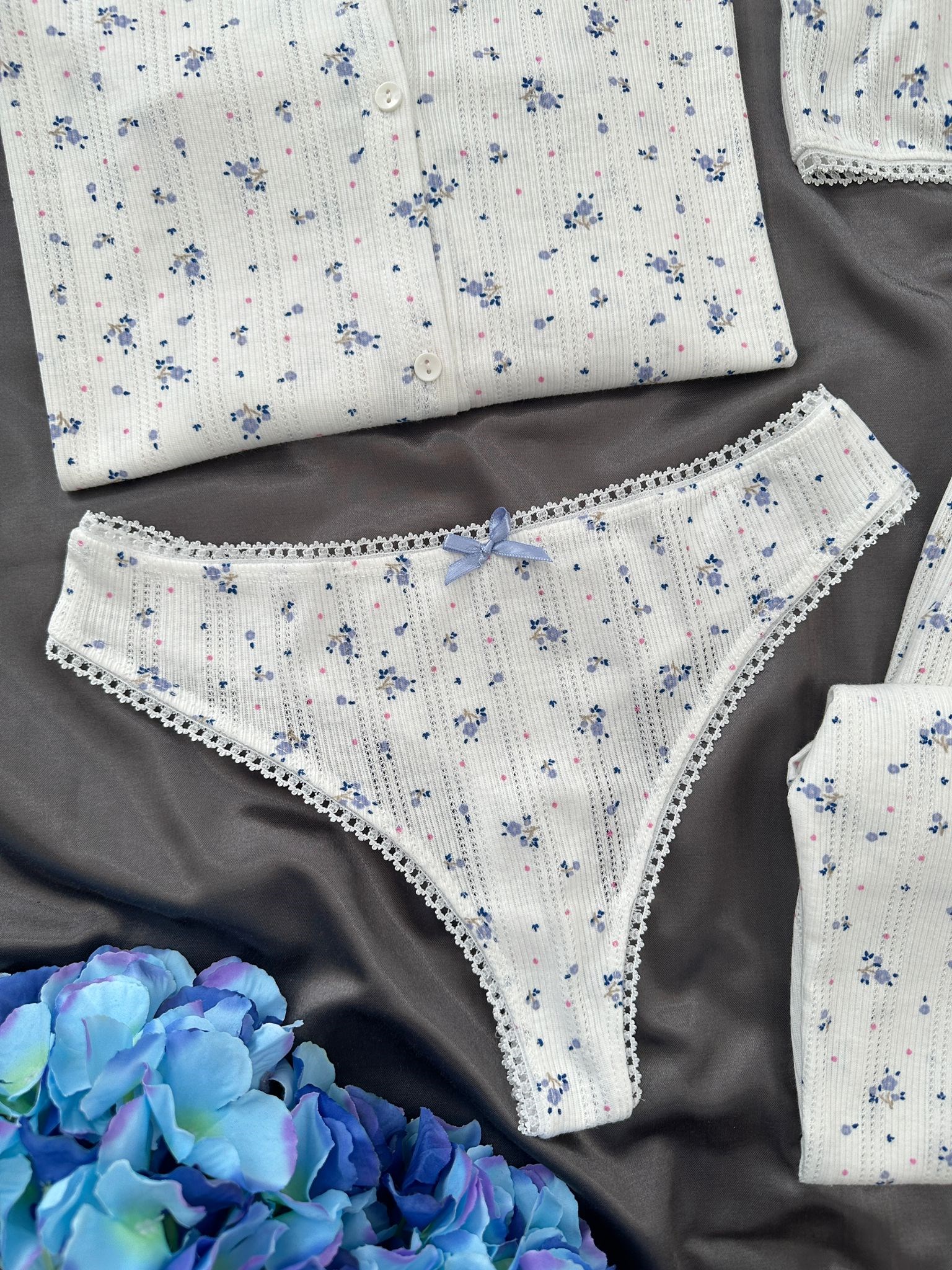 Mavi Çiçek desenli uzun kollu düğmeli üst, Askılı Pamuklu Gecelik , uzun paçalı alt, crop askılı üst ve külot ile birlikte