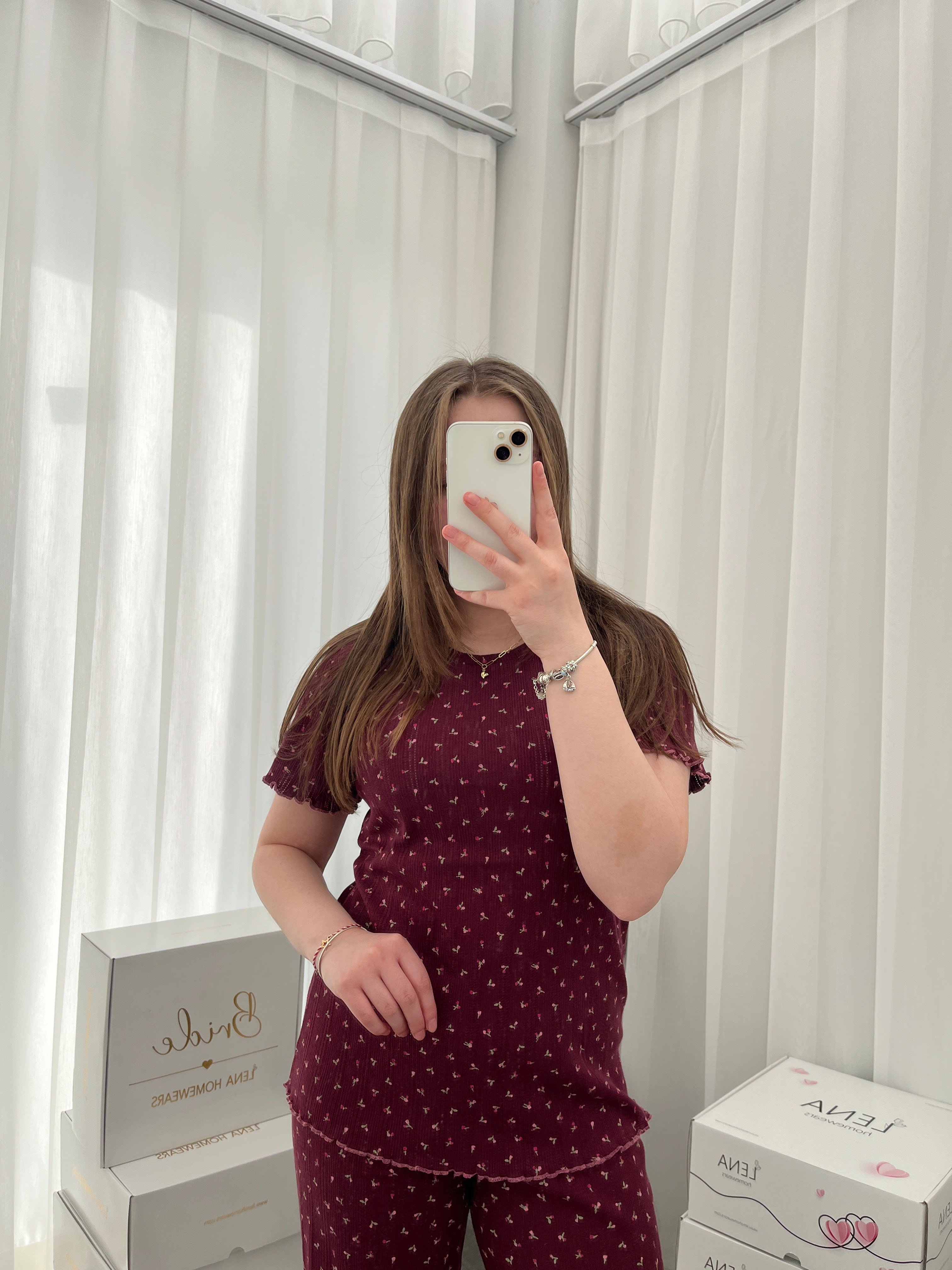 Mürdüm Çiçek Pamuklu Dörtlü Pijama Takımı