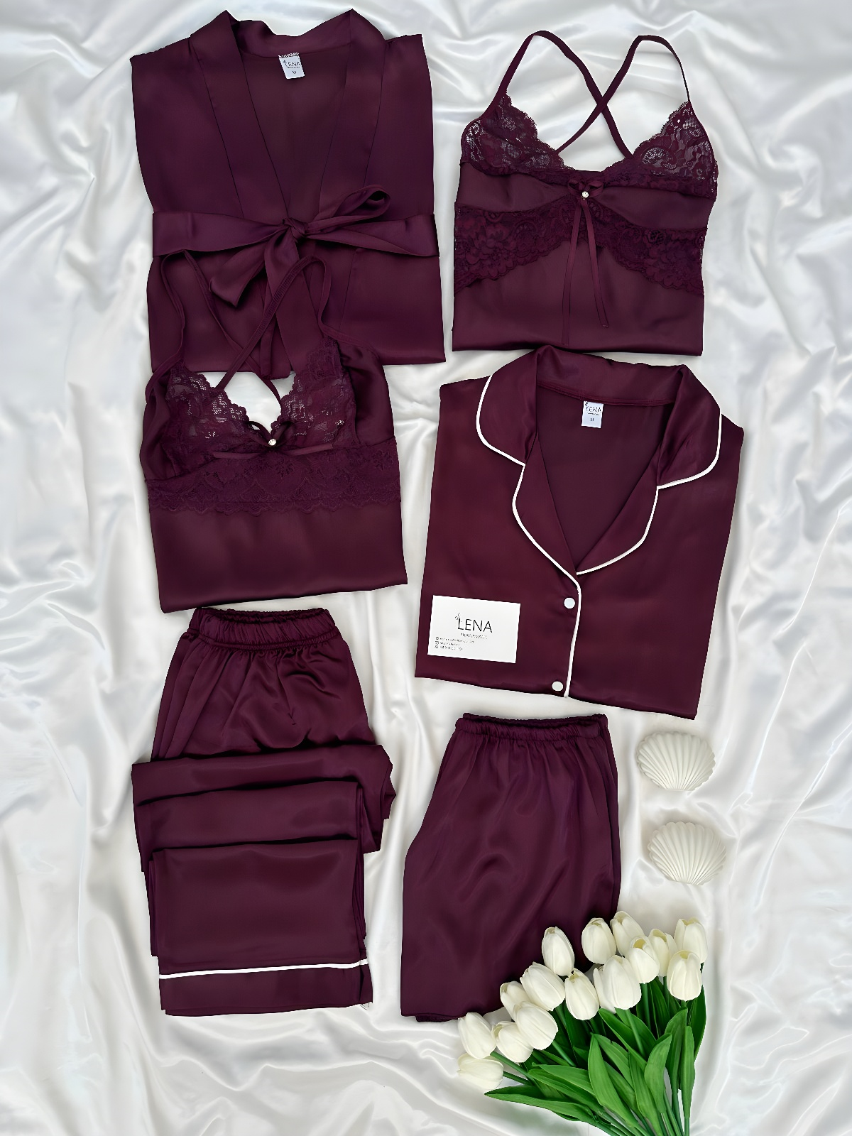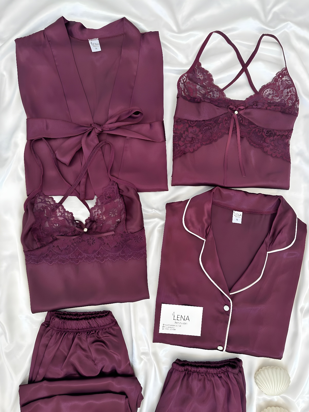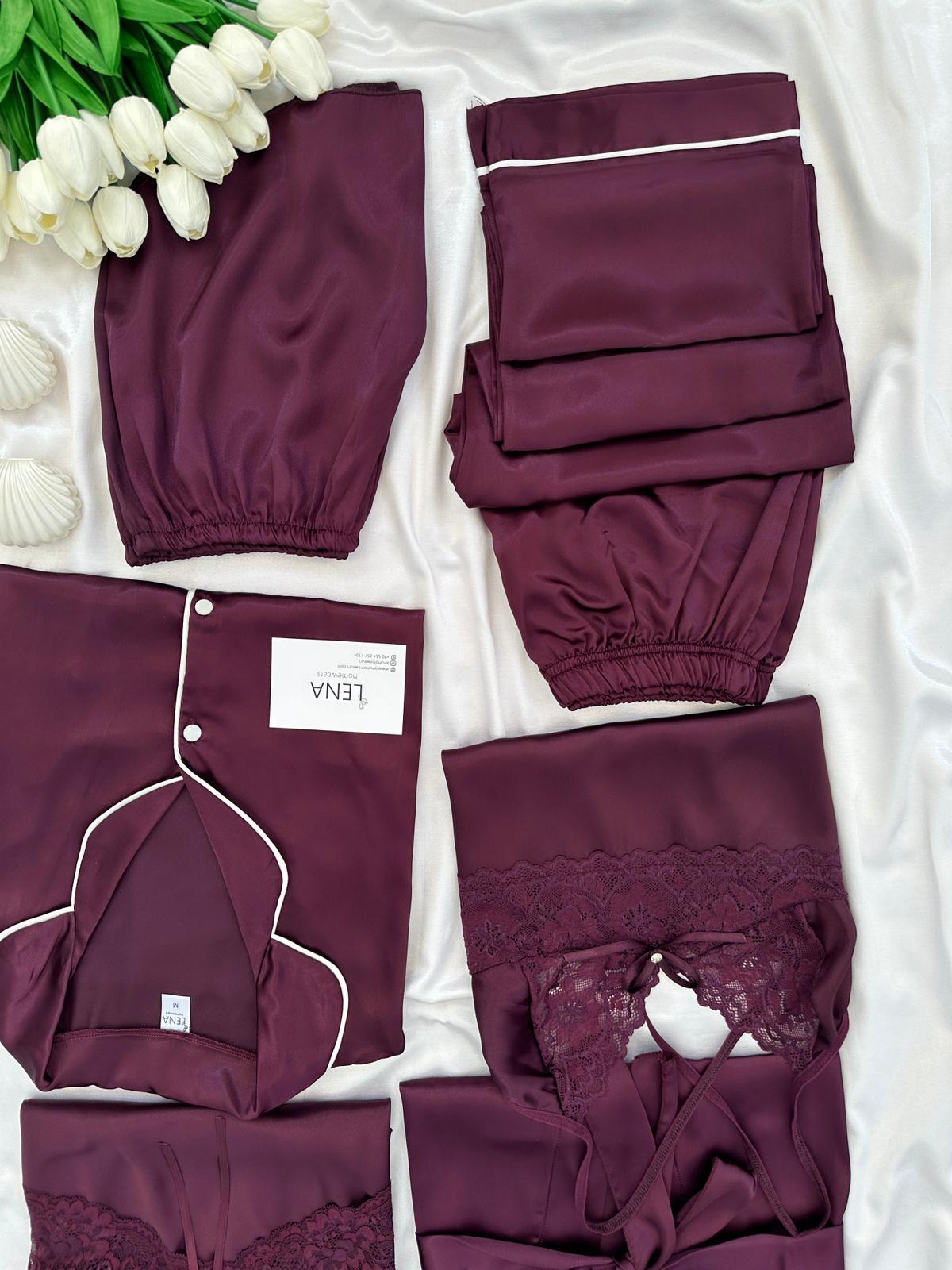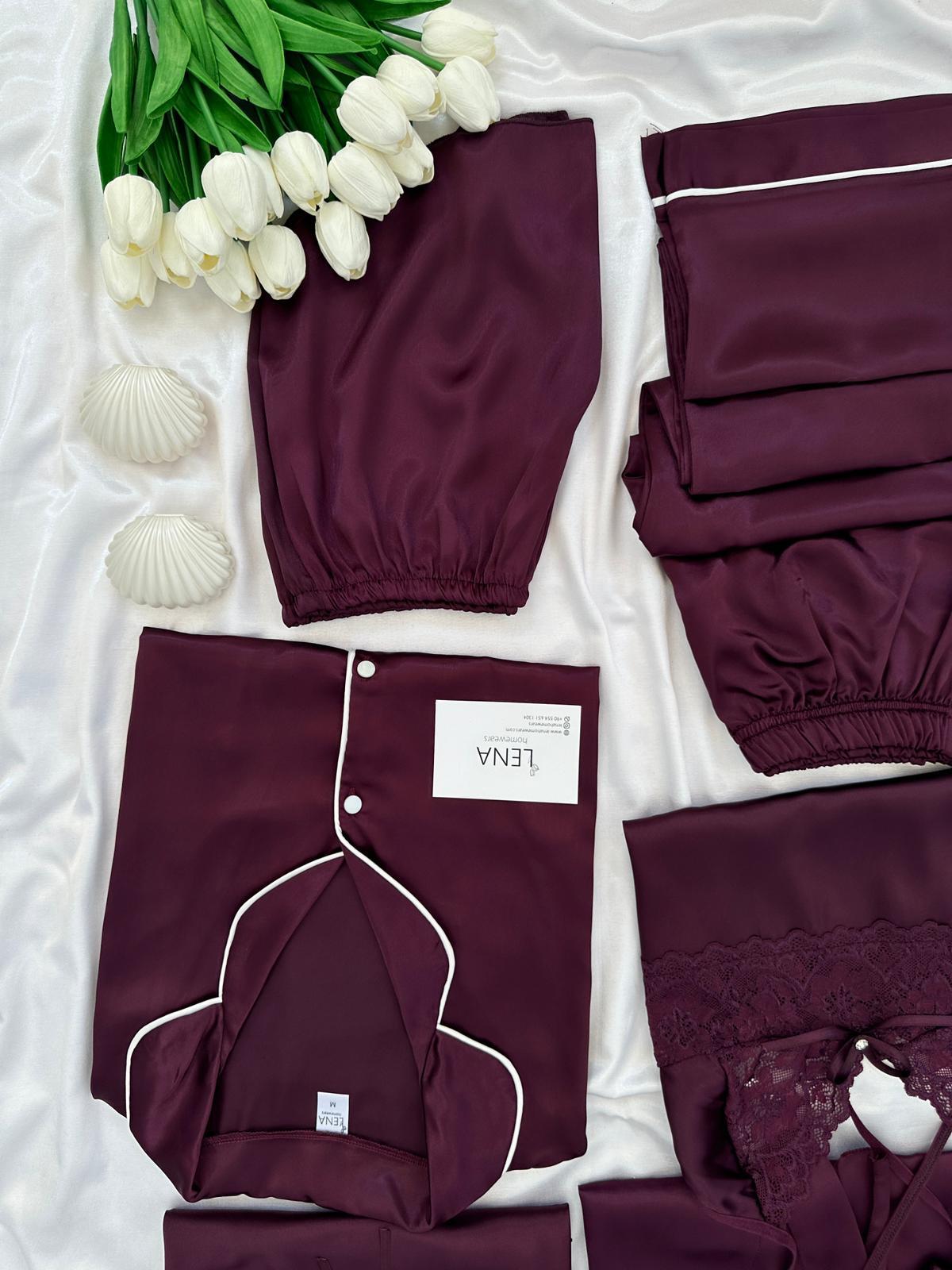 Mürdüm Harly Çeyiz Seti Kutulu Gönderim 🎁 Yumuşacık ipeksi saten dokusu ile dantel detaylı askılı mini gecelik, askılı üst ve şort; ekru biye detaylı düğmeli üst ve uzun paçalı alt pijama takımı, kuşaklı sabahlık ile birlikte ✨