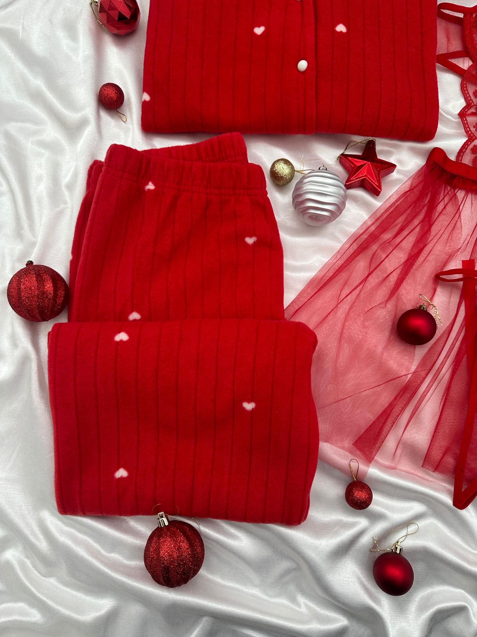 Hem sıcacık polar kalp desenli pijama takımı