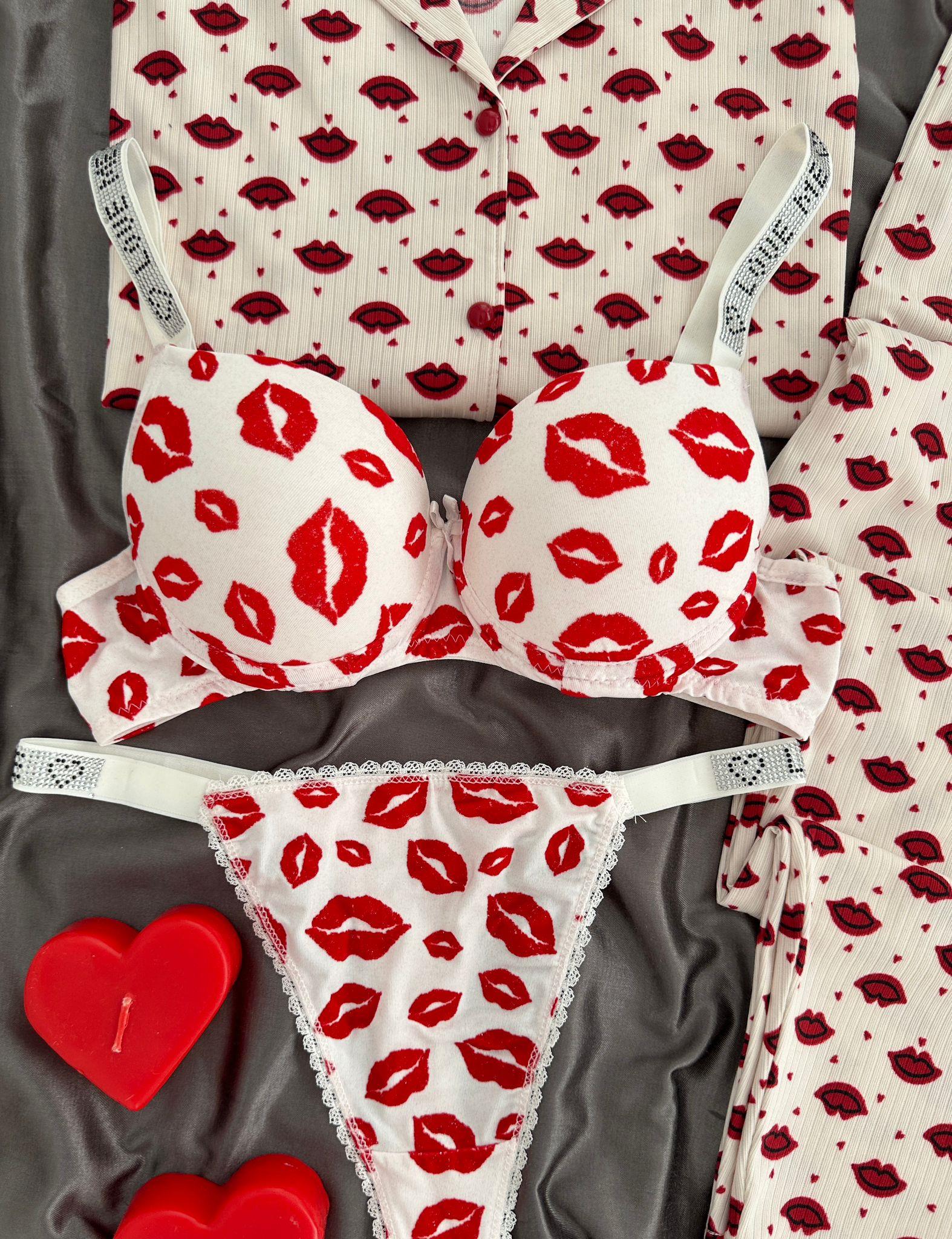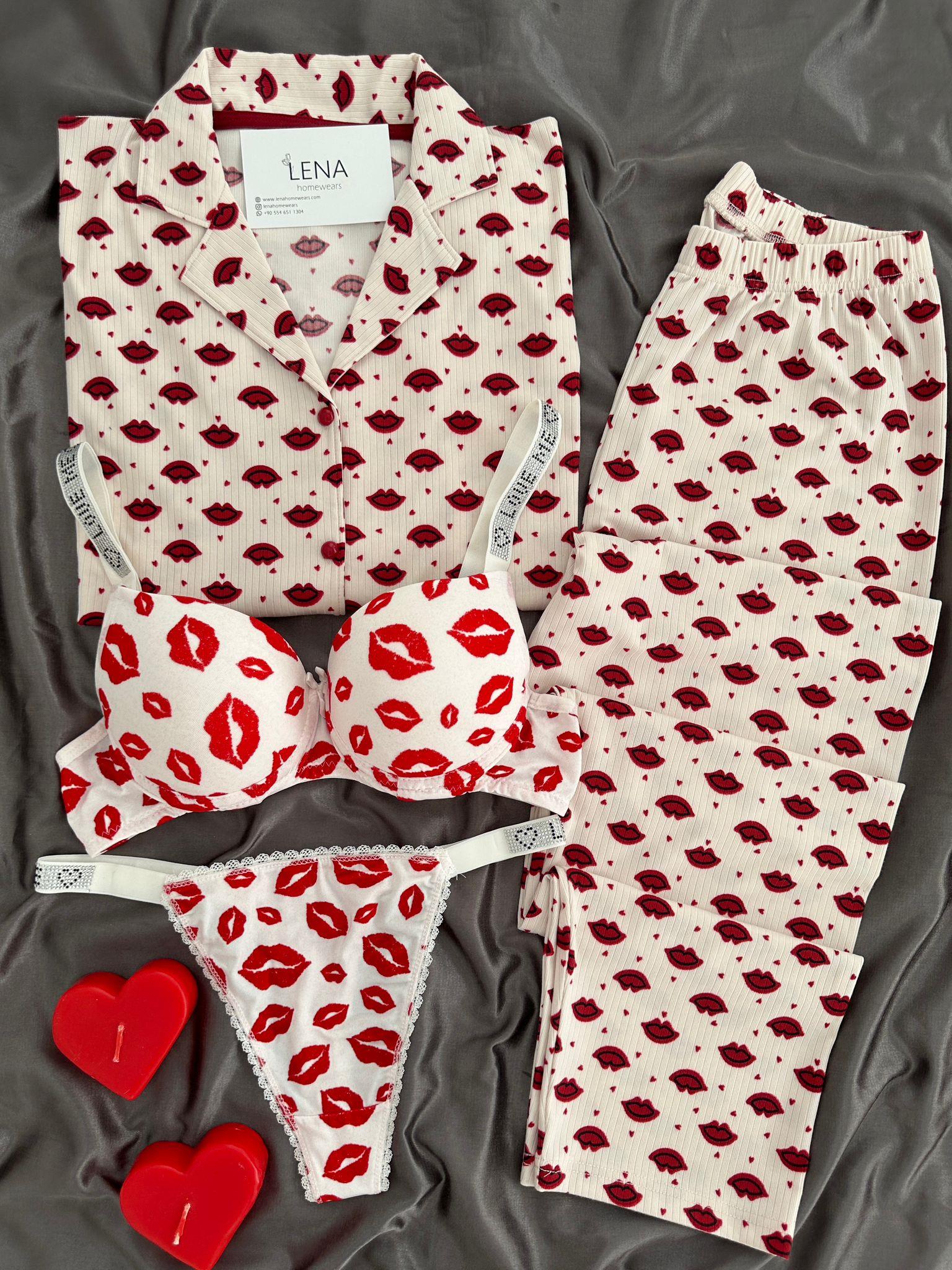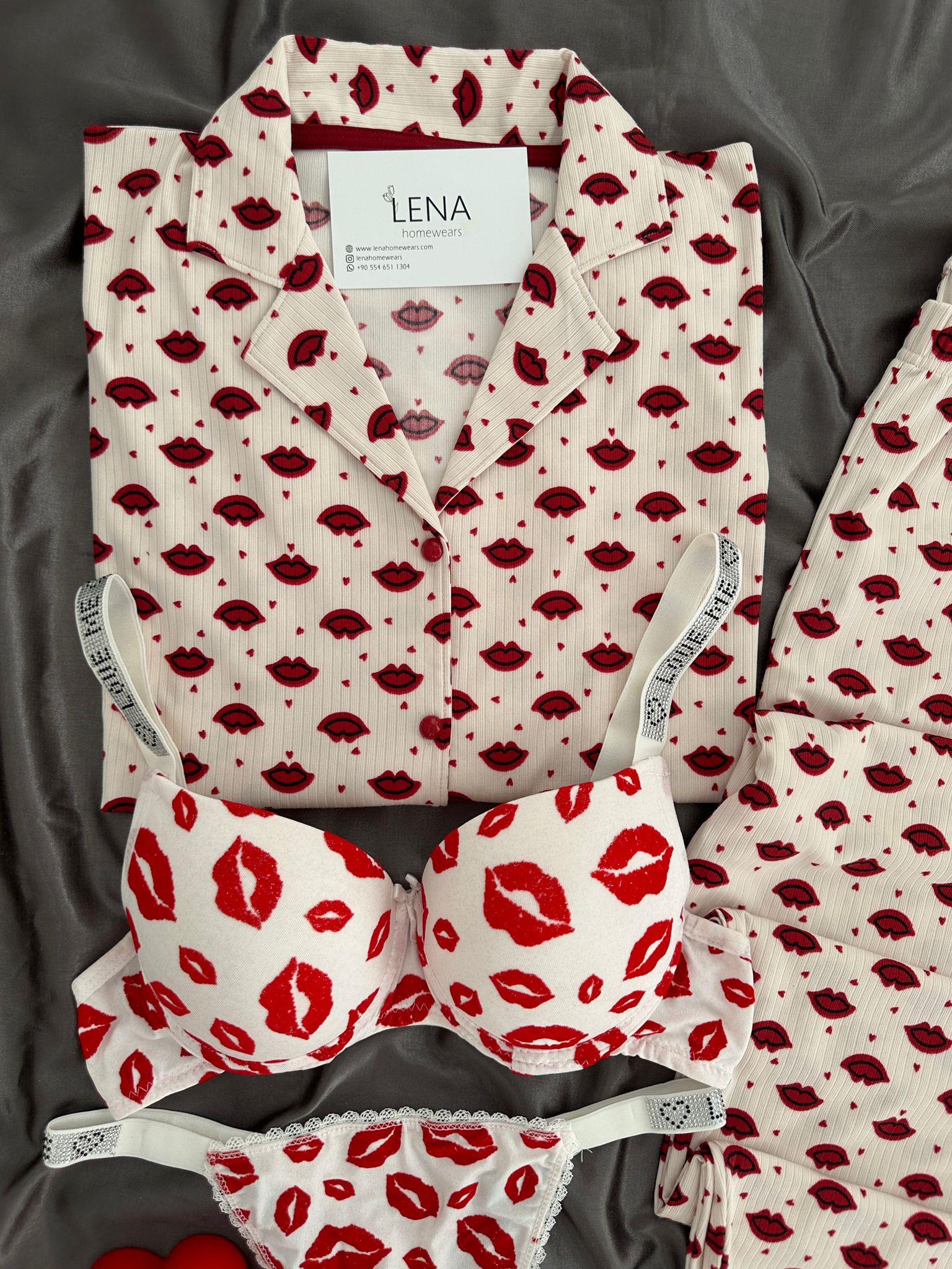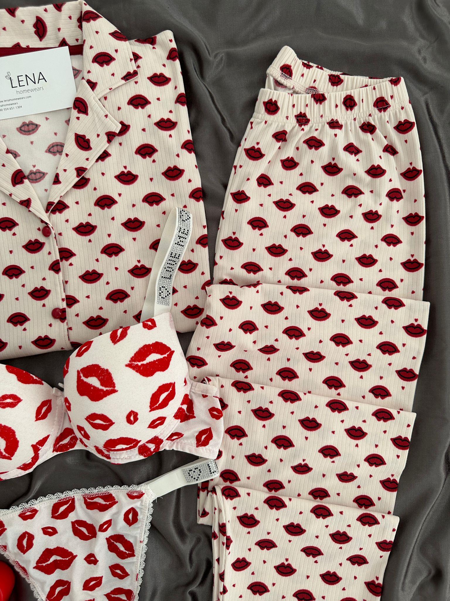Yeni Sezon ✨ Özel üretim Berlin kumaş 👌 Uzun kollu uzun paçalı yumuşacık sıcak tutan ama bunaltmayan yeni Berlin kumaş pijama takımı ve destekli dudak desenli dantel detaylı sütyen takımı ✨