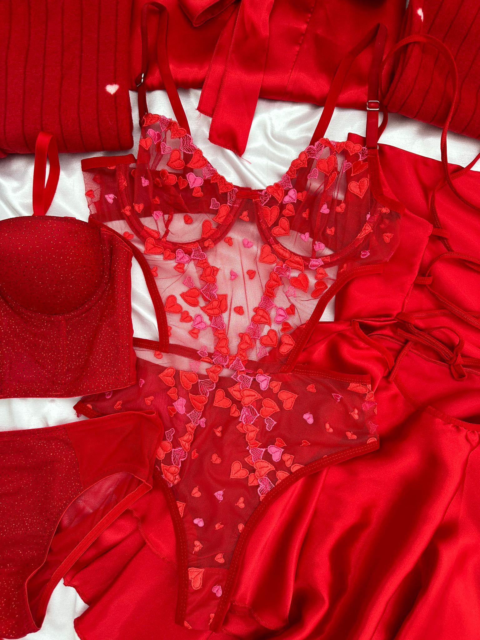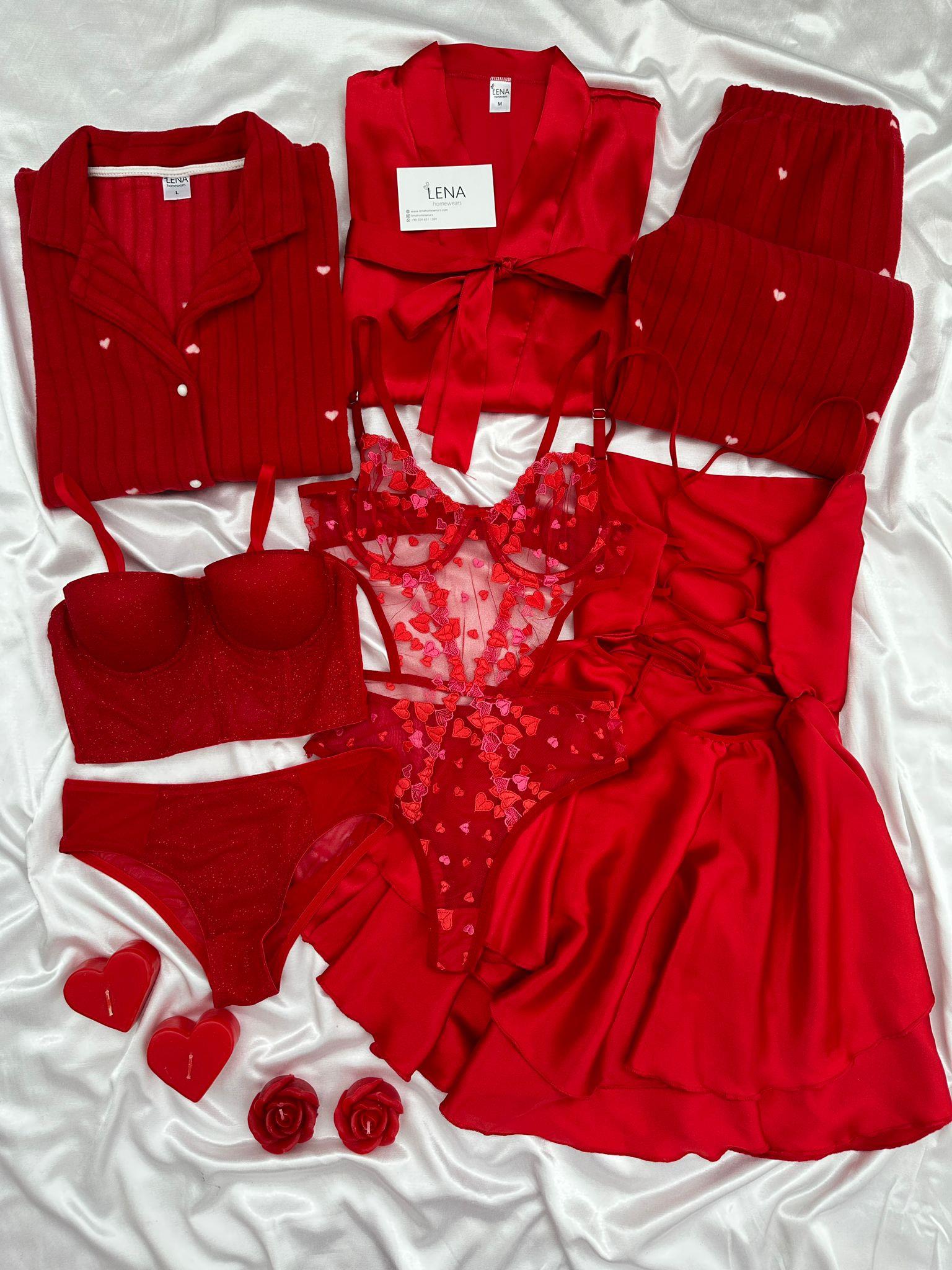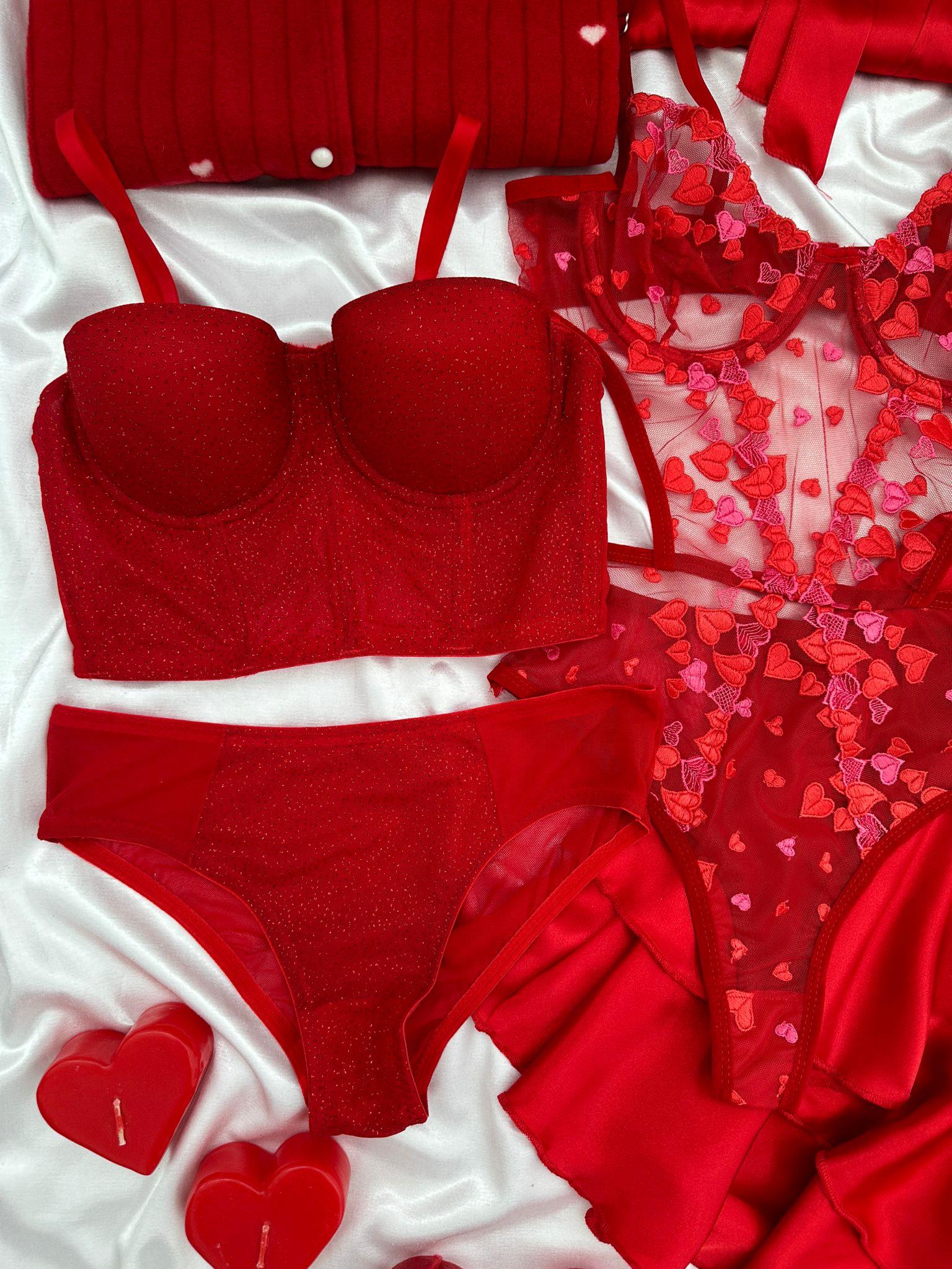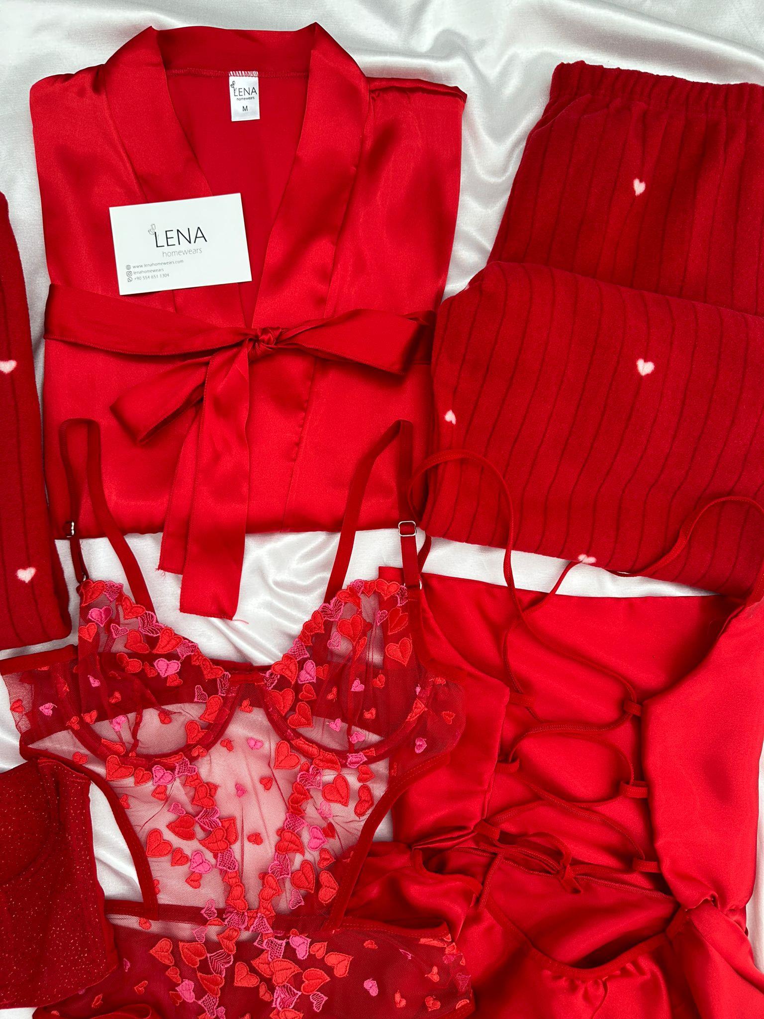 Sim detaylı destekli korseli sütyen takımı ile birlikte toplam 7 parçalı kutulu çeyiz seti