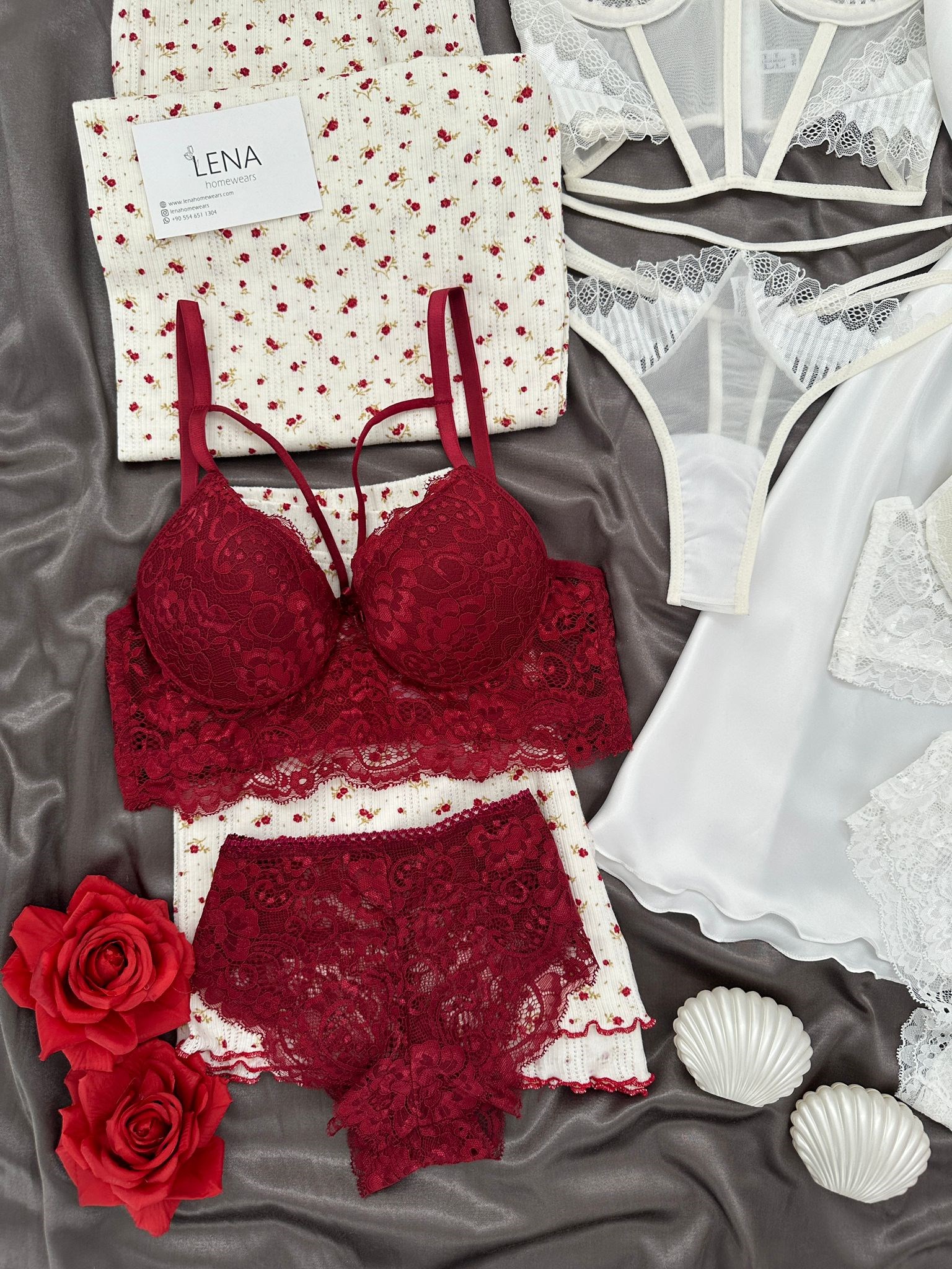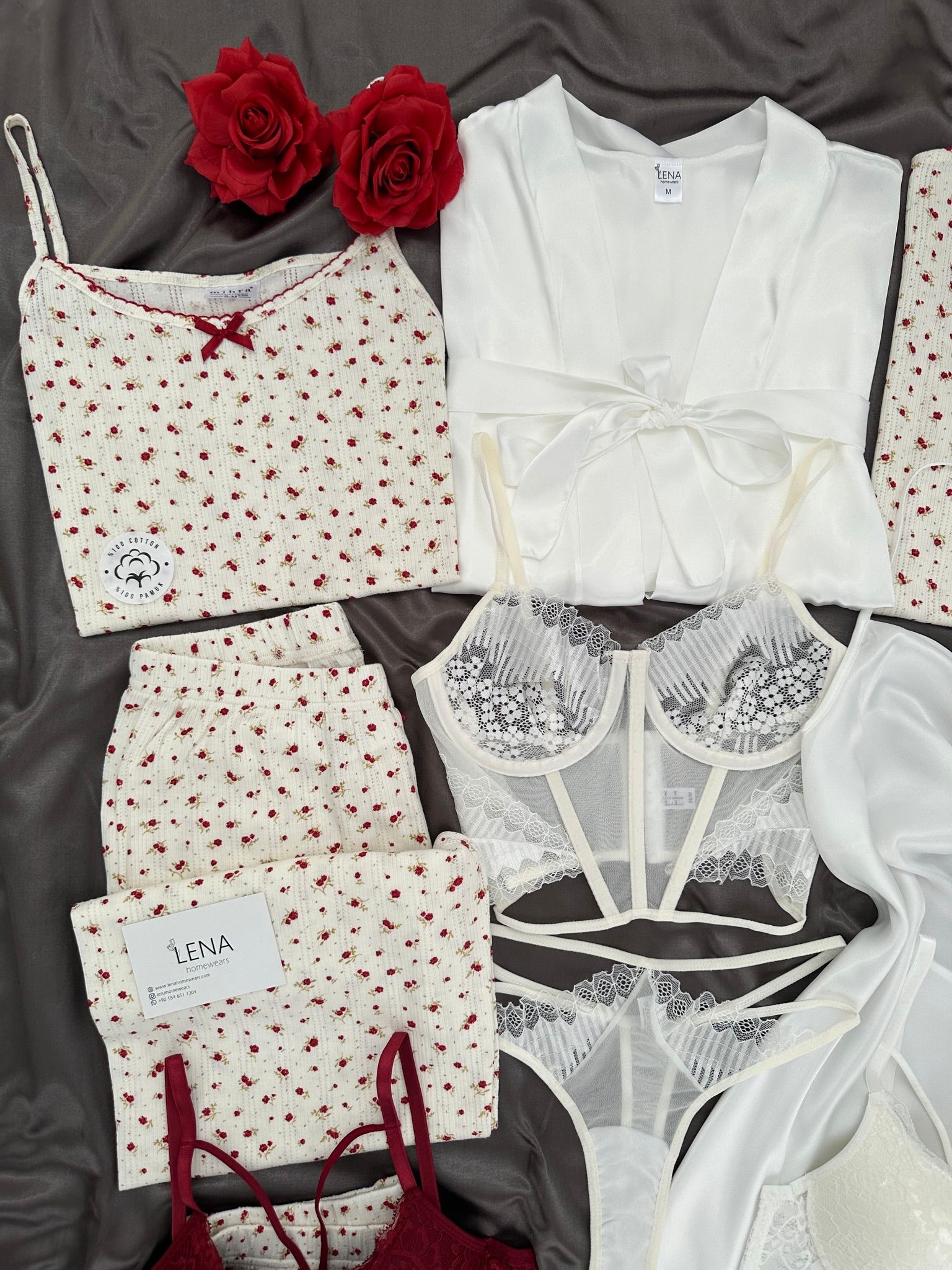 Transparan tül dantel detaylı balenli ekru korse bralet ve tanga; dantel ve ip detaylı destekli balenli ekru ve bordo sütyen ve iç çamaşırları bulunmaktadır.