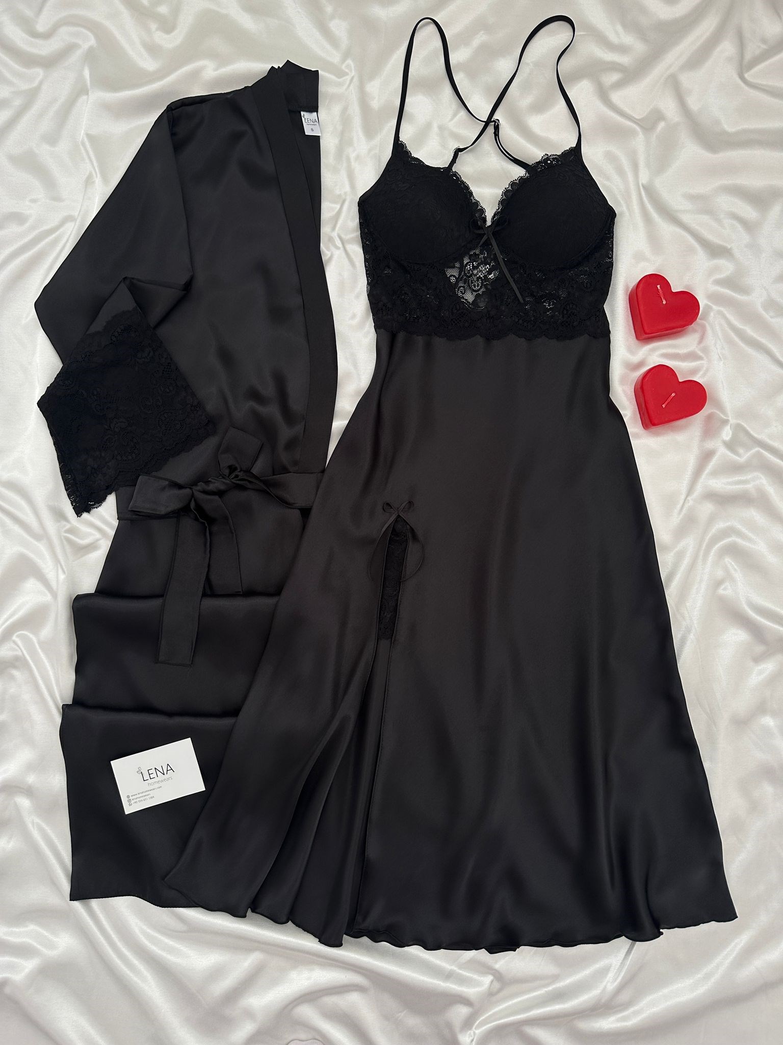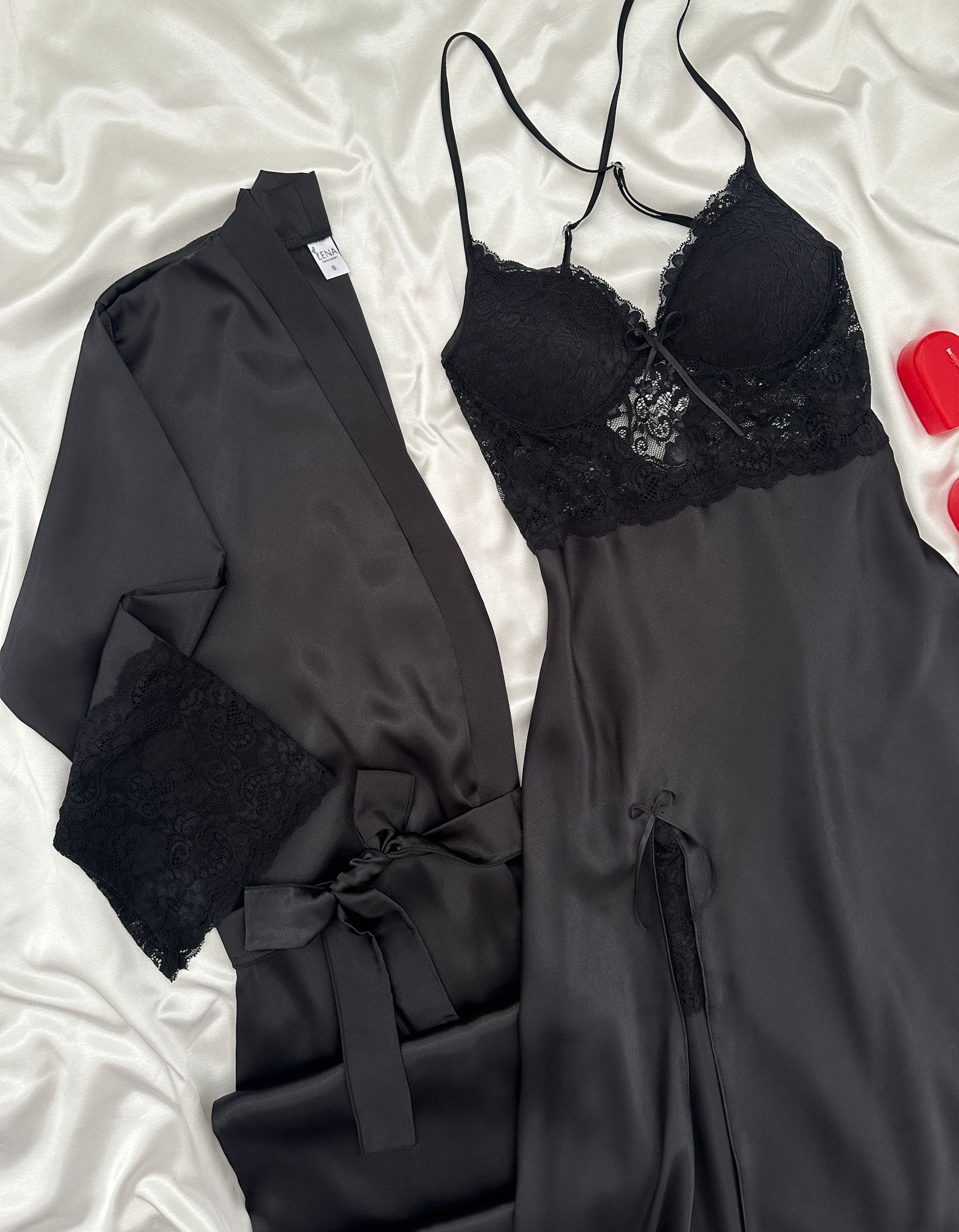 Siyah Enchante Lüks Dantelli Yırtmaçlı Uzun Gecelik & Sabahlık