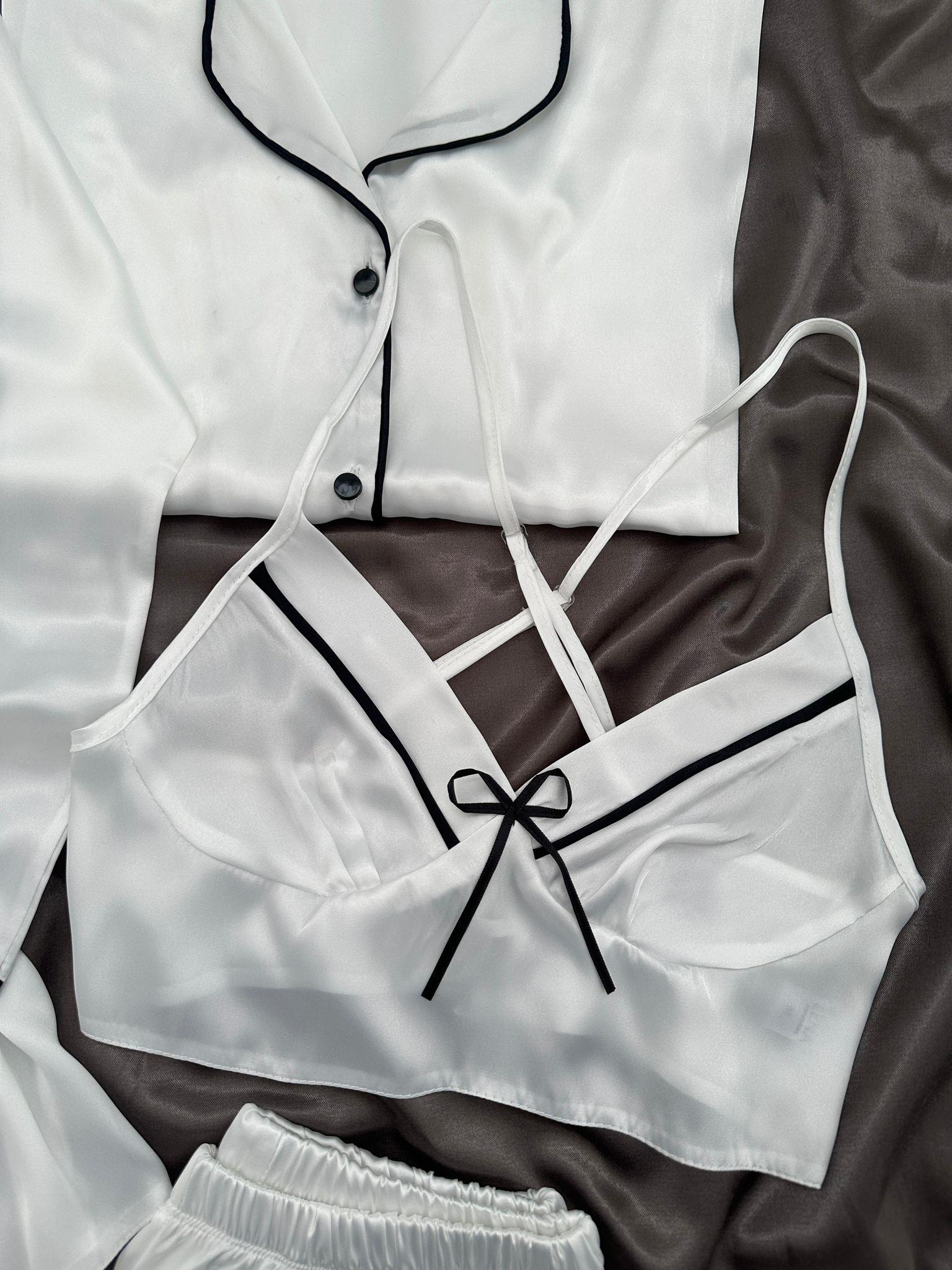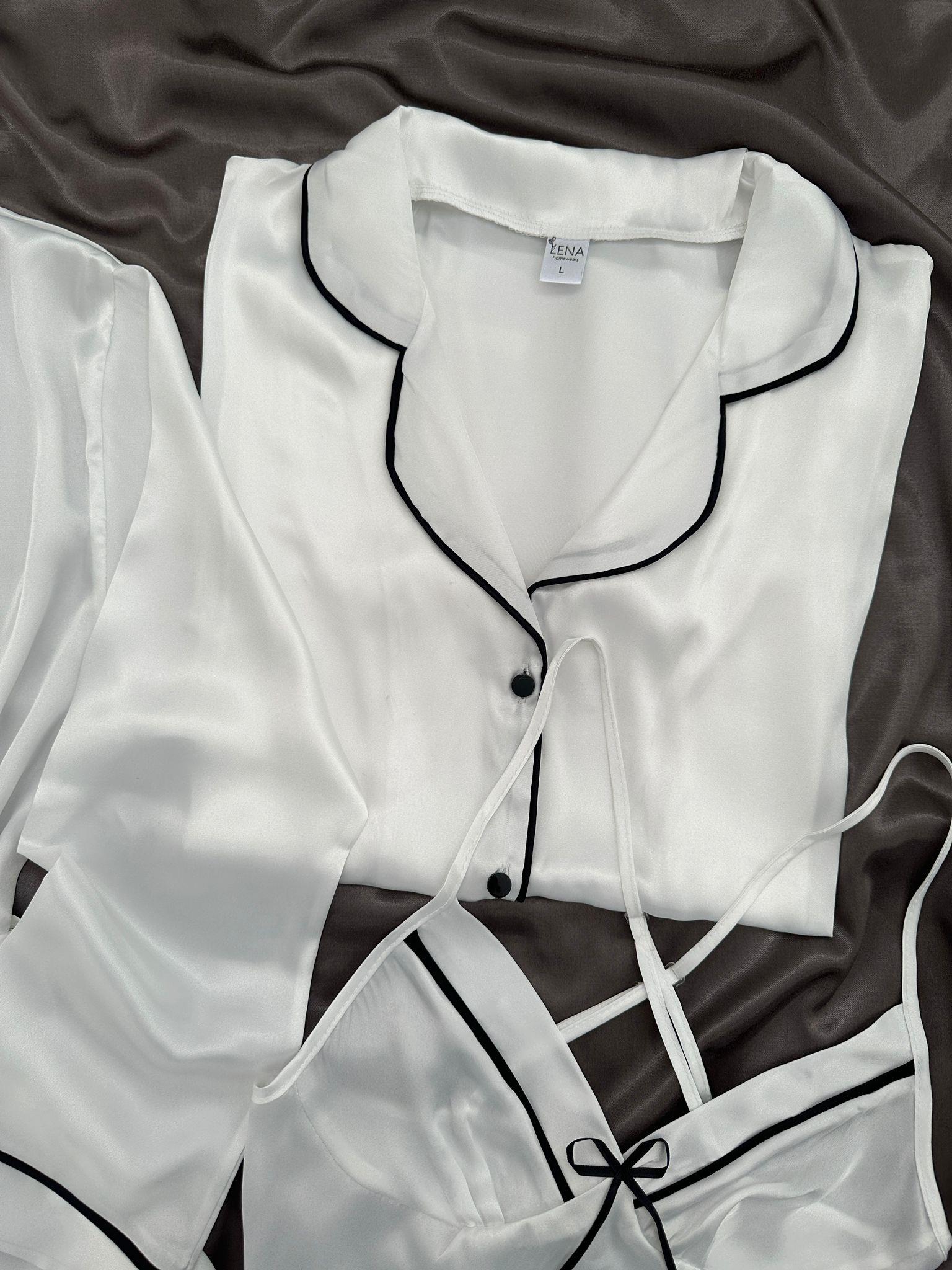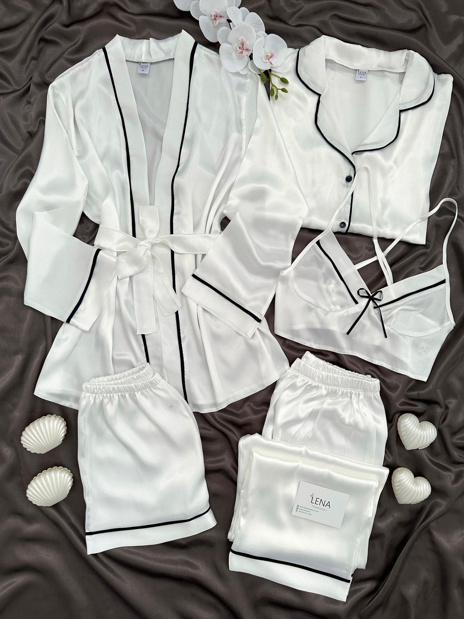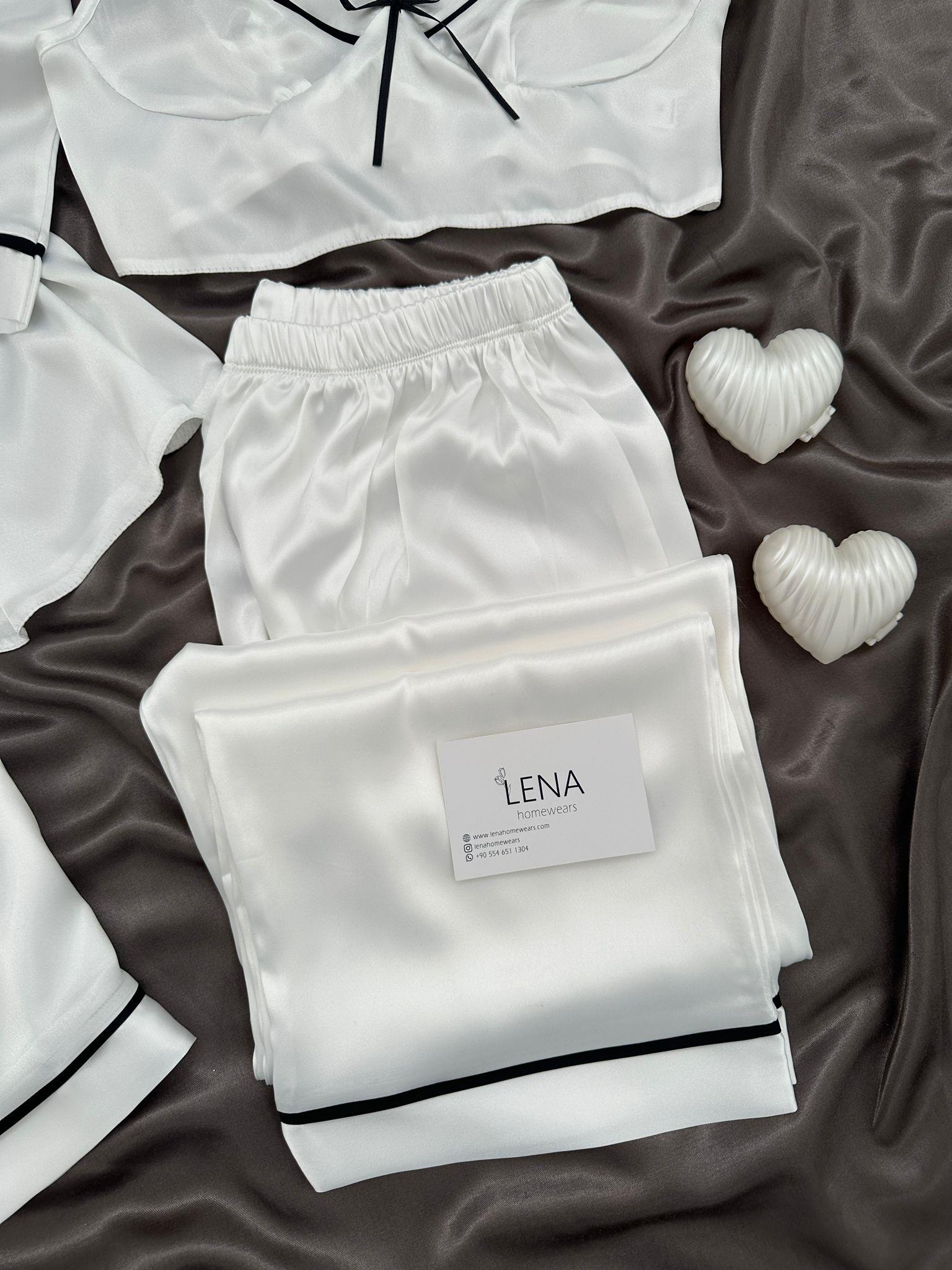 Lüksü Hisset Sınırlı Sayıda 🤍 Sadece Lena’da🤍 Kendi değerinden taviz vermeyen her kadının dolabında bulunması gereken bu 5 parça; siyah biye detayı ve ipeksi saten dokusuyla Lena zerafeti ile bir araya geldi ✨ Ekru saten kuşaklı sabahlık, sırtı bağcıklı ayarlanabilir askılı fiyonk detaylı crop üst, beli lastikli şort; düğmeli kısa kollu üst ve uzun paçalı alt pijama takımı ile birlikte