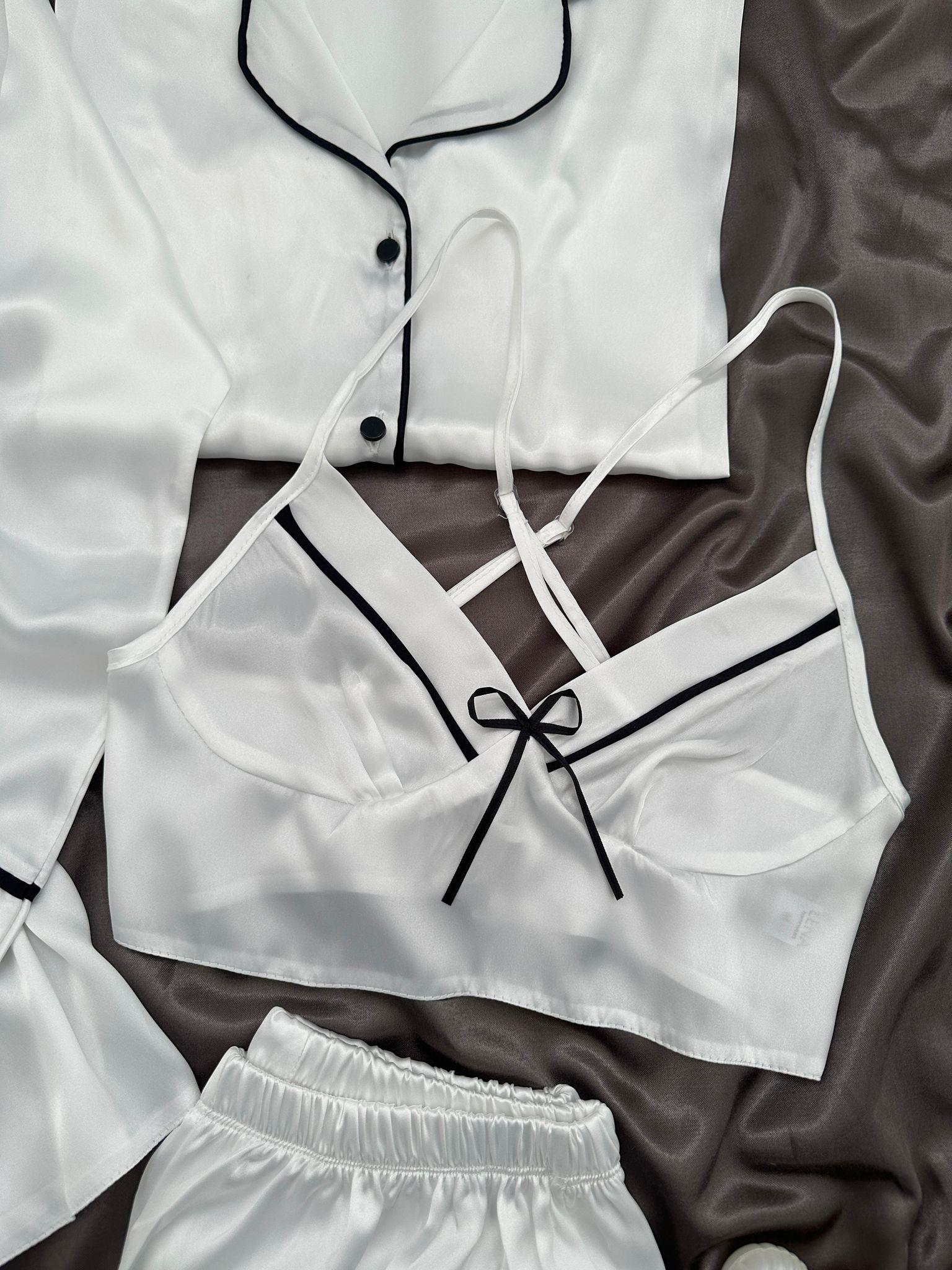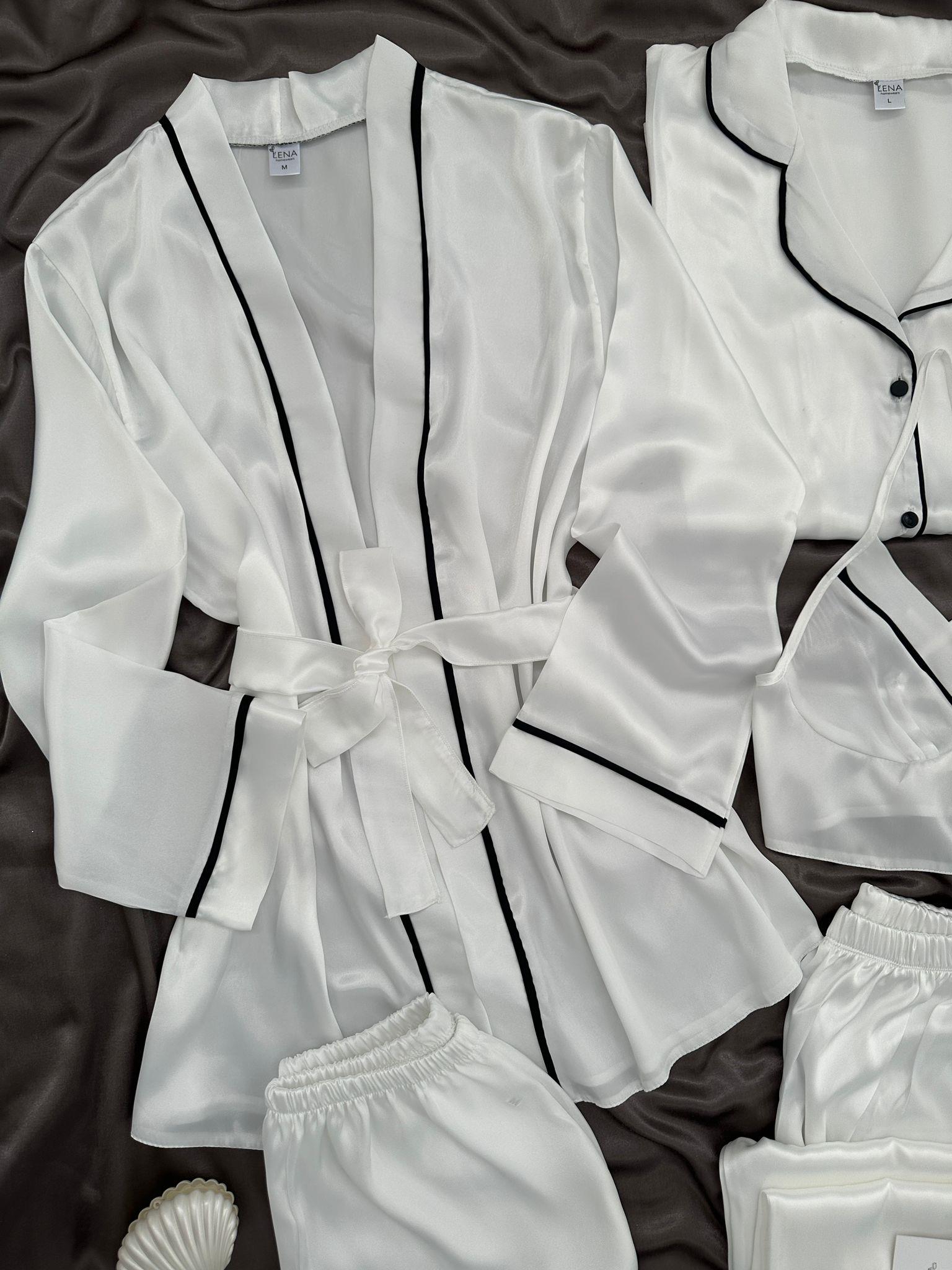 Sınırlı Sayıda 🤍 Sadece Lena’da🤍 Kendi değerinden taviz vermeyen her kadının dolabında bulunması gereken siyah biye detayı ve ipeksi saten dokusuyla Lena zerafeti ile bir araya geldi ✨ Ekru saten kuşaklı sabahlık, sırtı bağcıklı ayarlanabilir askılı fiyonk detaylı crop üst, beli lastikli şort;