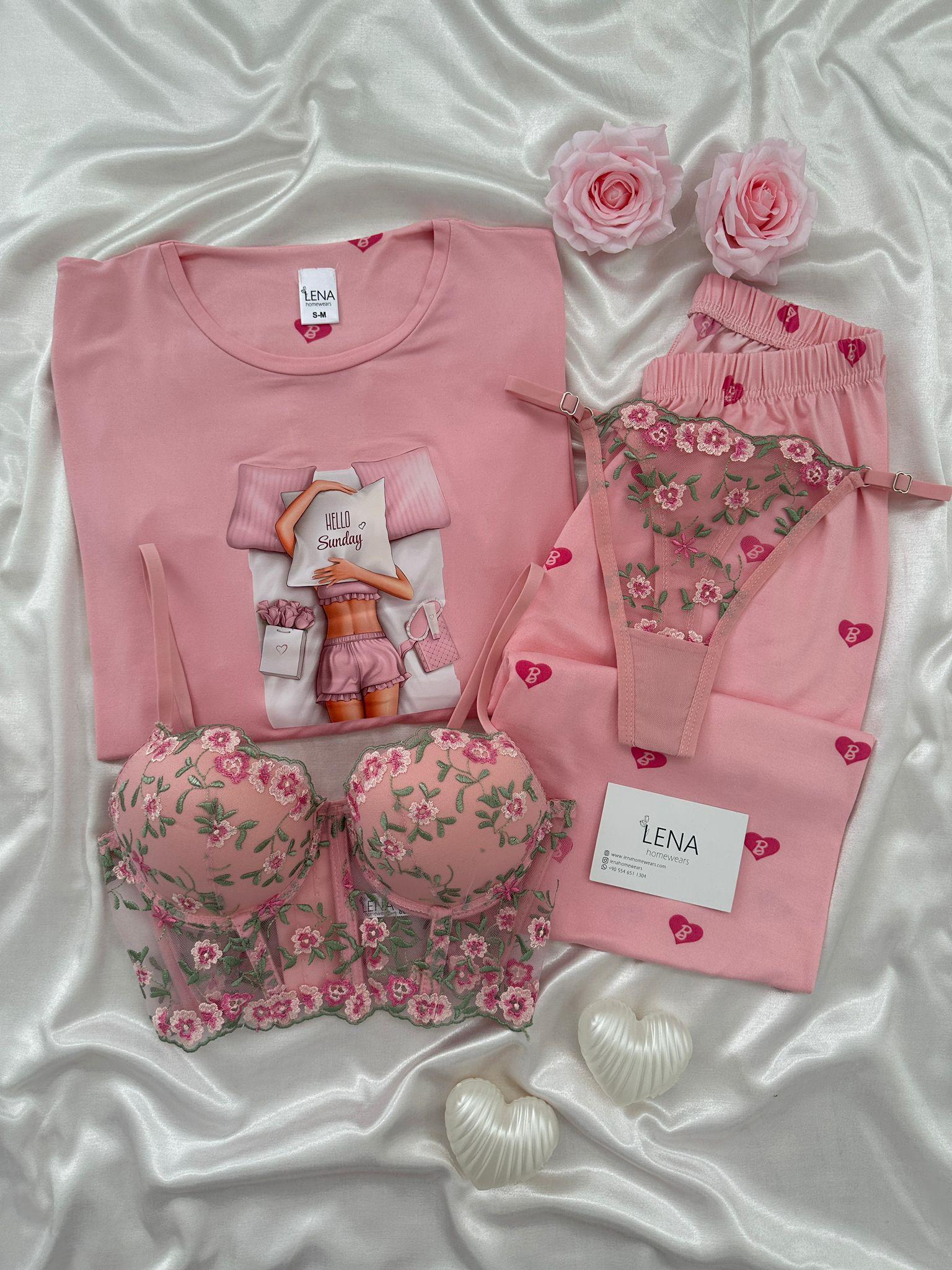 Yumuşacık Milan kumaş uzun kollu uzun paçalı bisiklet yaka baskı detaylı, altı kalpli pijama takımı İthal çiçek işlemeli korseli büstiyer ve iç çamaşırı ile birlikte ✨ Sm/L/XL/XXL beden / normal kalıp/ esnek kumaş 75-80-85-90 beden / b kap / destekli